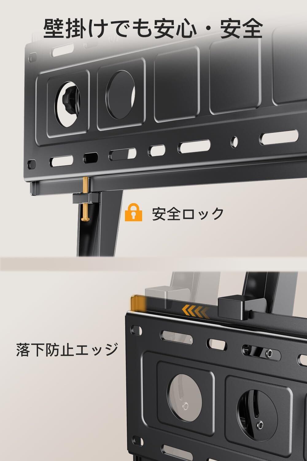 【壁からの距離が50mm】PERLEGEARの薄型壁掛け金具は、壁からわずか50mmの位置にテレビを固定し、省スペースの薄型外観を実現します。さらに便利なように、ブラケットには落下防止エッジ機構が組み込まれており、テレビを簡単に取り外したり固定したりできます。