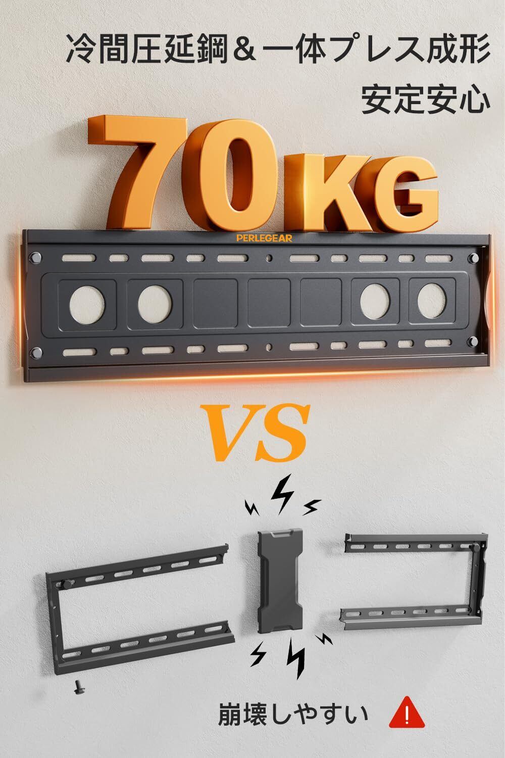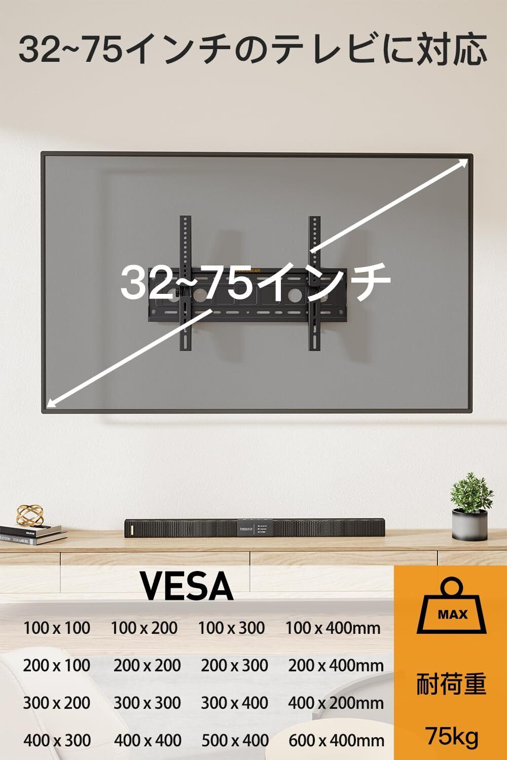 【高い汎用性で幅広いテレビに対応】PERLEGEARのテレビ壁掛け金具は、VESA規格100x100 ~ 600x400mmの75kgまでのほとんどの32インチ~75インチのテレビに対応します。ご購入前に、テレビの画面サイズ、重量、VESA規格をご確認ください。