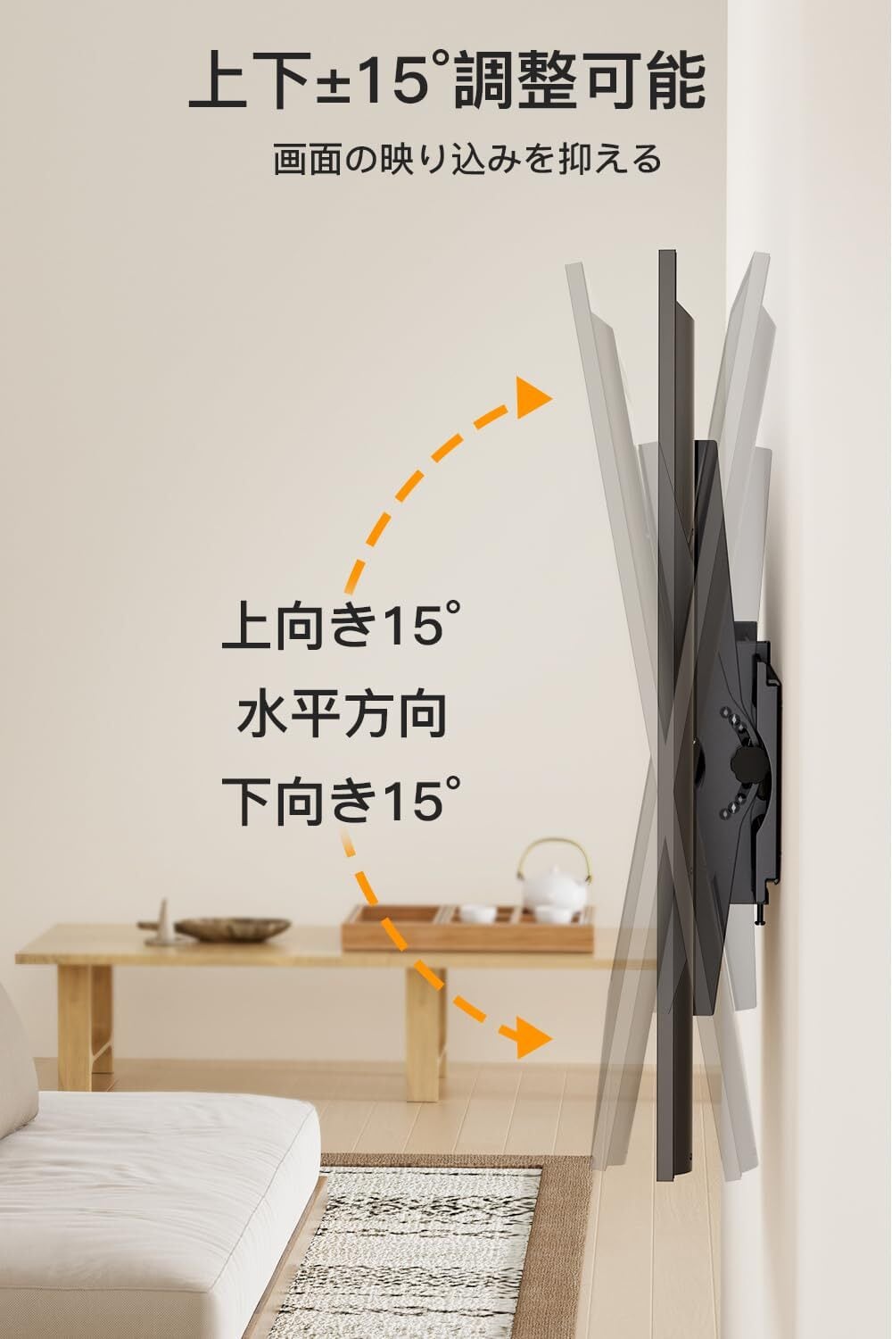 【グレアを最小限に抑える】画面を視聴位置に向かって上下±15度に傾けることで、不快なグレアにさよならしましょう。また、ティルト式かべかけブラケットを使用して、壁プレート上でテレビを左右に動かし、壁の中央に完璧に配置することもできます。