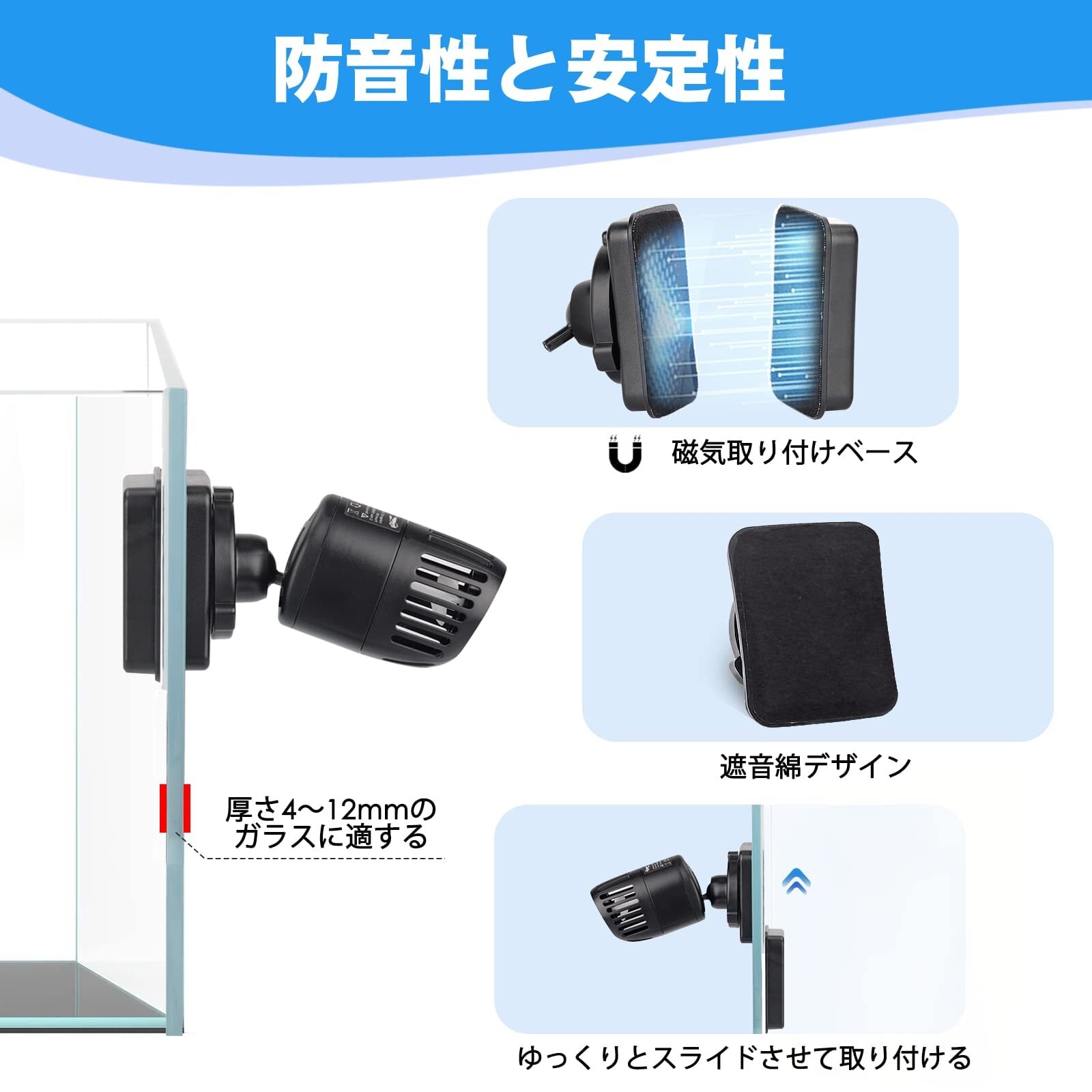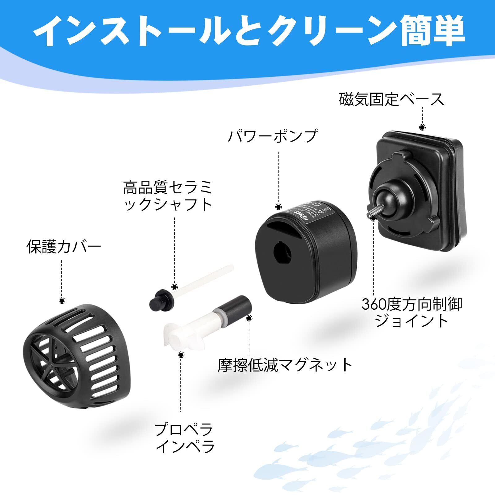 【取り付け簡単】:磁気設計により、ポンプは水槽の壁にどこでも固定できます。コントローラーと機器また電源を接続してから使用でき、初心者でも使用でき、取り付けが簡単です。(磁気ベースを取り付ける時は怪我をしないよう気をつけてください。)