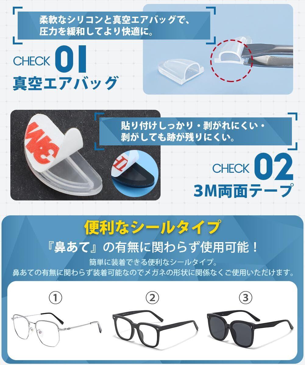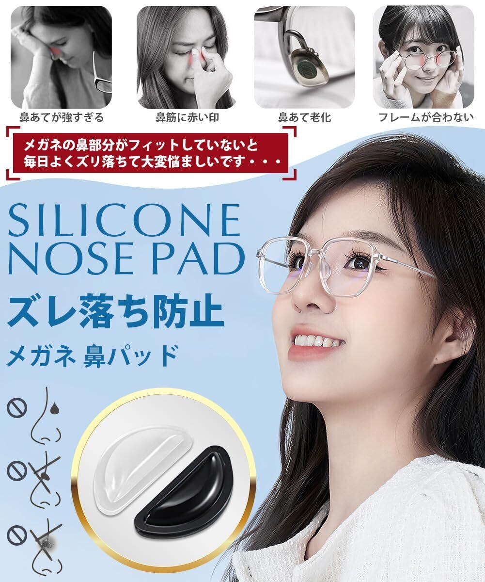 【強力3M・高品質シリコン】鼻パッドは高品質シリコンを採用しており、従来のシリコン鼻パッドよりも柔らかいです。そのため、肌にやさしく、摩擦でのスレ感を感じなくて快適な装着感を実現しています。また、長時間使用しても痛くなりにくいので、一日中快適にお使いいただけます。メガネずれ落ち防止鼻パッドと眼鏡の接着部には強力な3M両面テープが採用されており、鼻パッドは眼鏡にしっかりと貼り付けて、外れにくいようになっています。