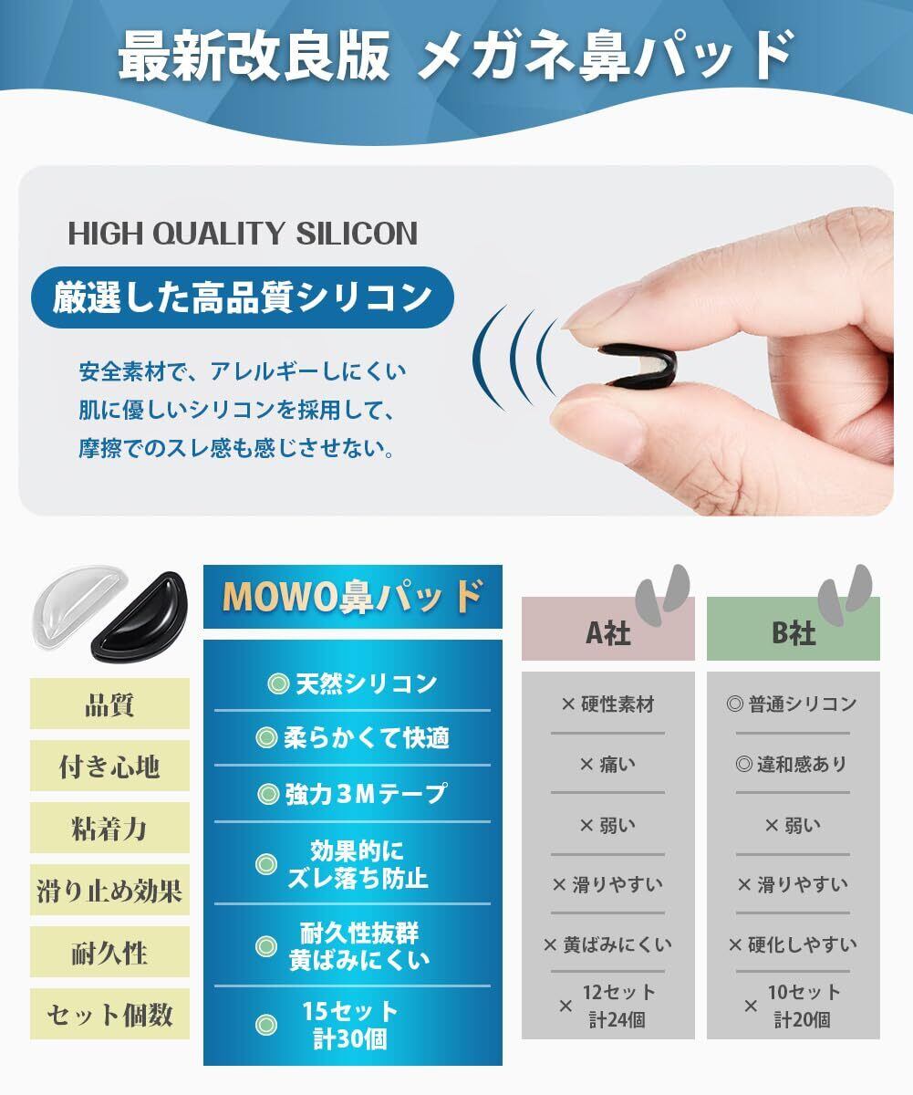 [MOWO] メガネ 鼻パッド 眼鏡鼻パッド 【簡単に滑り止め・強力3M両面テープ】 【専用収納ケース・メガネクロス付き】メガネずれ落ち防止 ノーズパッド 眼鏡 鼻あて シリコン製 メガネ跡軽減 軽量 粘着式 15セット計30個