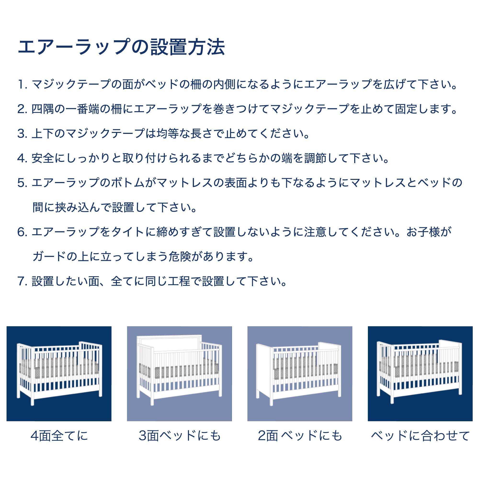 ベッドの中の空気をしっかりと循環させるベビーベッドガード。マジックテープで長さの調節が可能。