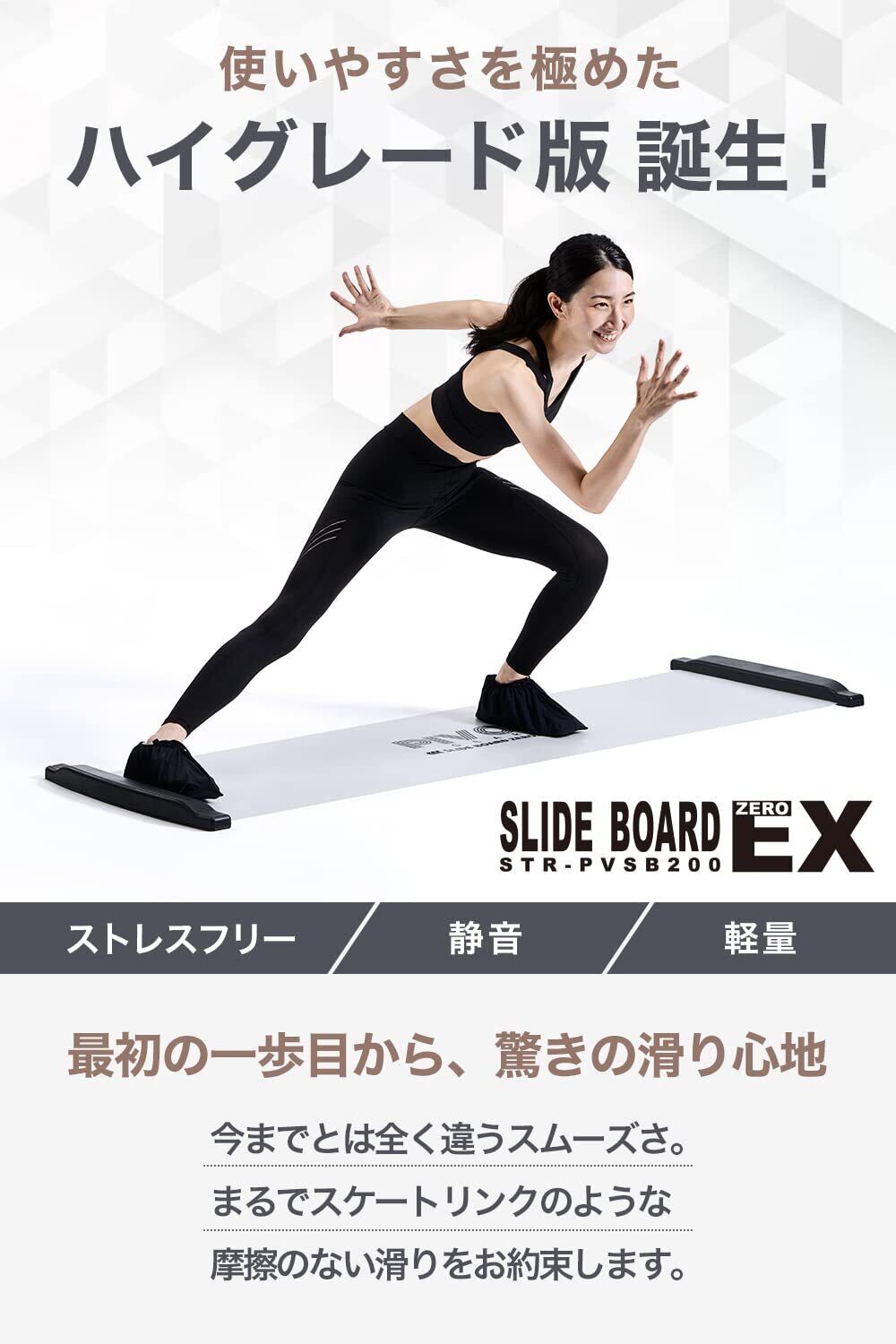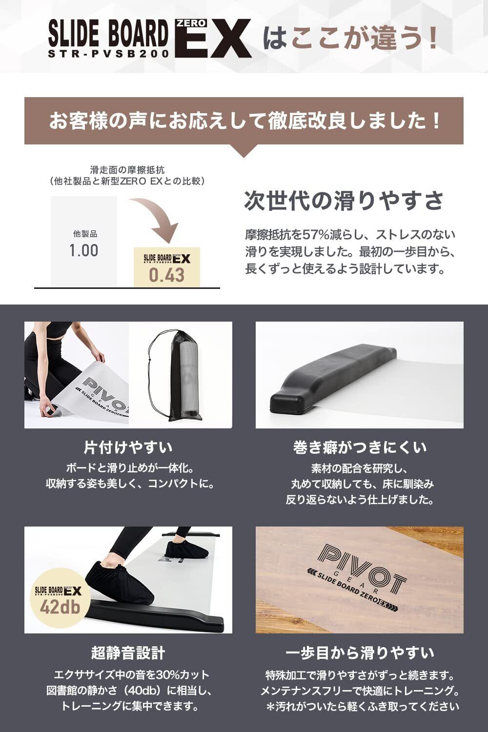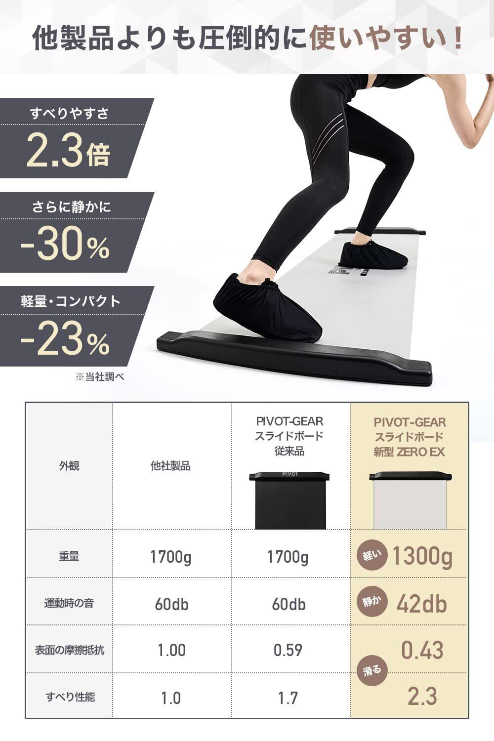 【スライドボードZERO EX登場】特殊コーティングで脅威の滑り性能と裏地レス化!とにかく滑る。摩擦抵抗をかぎりなく減らしなんと他社の2.3倍の滑りやすさを実現。さらに運動中の音も30%カットして静かになりました。巻き癖がつきにくい素材で床になじみやすく平らに敷くことができます。裏地レスで片づけやすく重さも23%軽量化コンパクトで持ち運びやすい。さらに運動靴を持っていなくても使えるようにお試し用シューズ付き!PIVOT-GEARスライドボードZERO EXはお客様の声をお聞きし徹底的に改善されたあらゆる面で優れたスライドボード(スライディングボード)です。