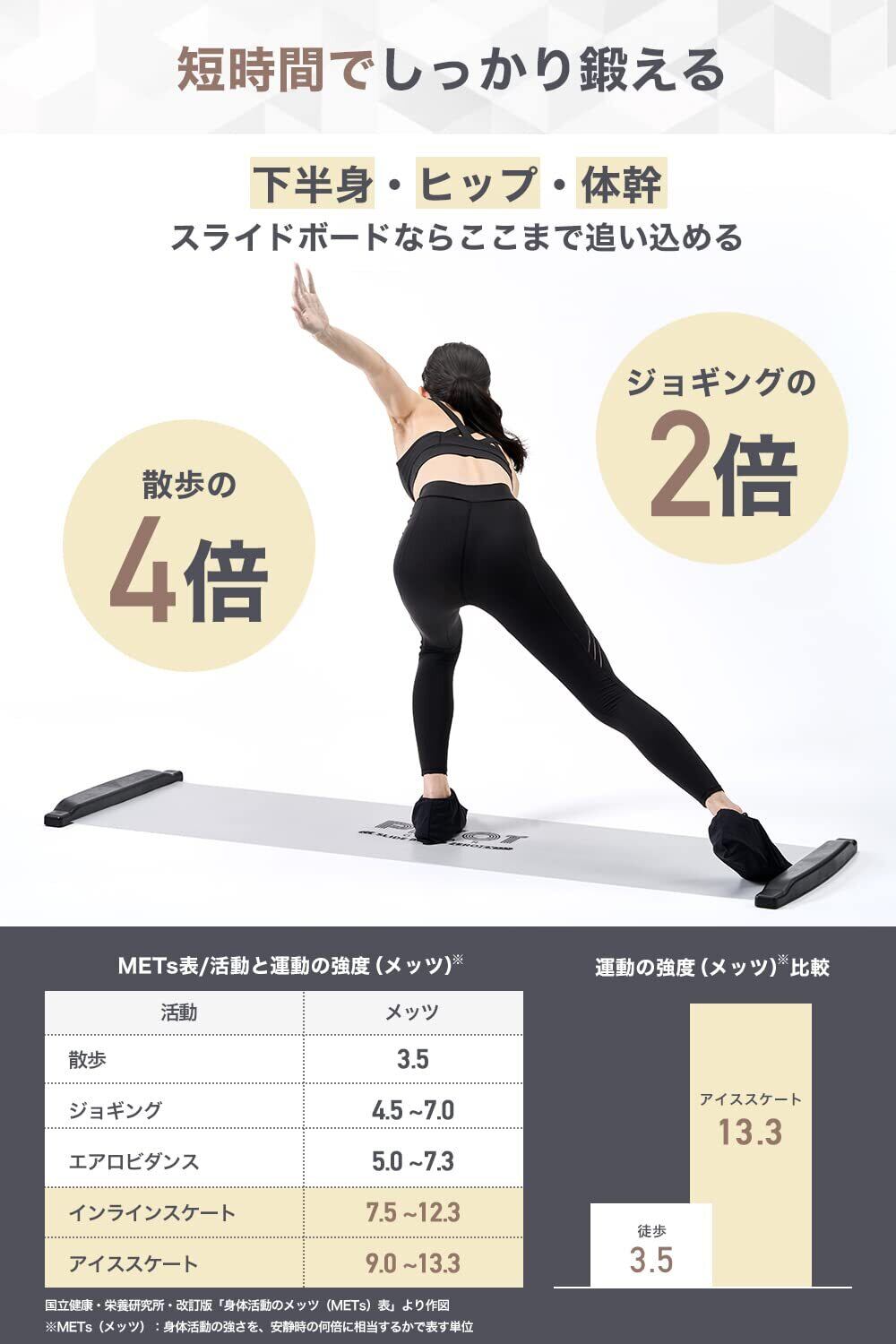 【スライドボード トレーニングとは】スライド ボード(スライディング ボード)は、もともとスピードスケートやアイスホッケー インラインスケートなどの選手が、相手よりも0.1秒でも前に出られるようにスケーティングの細かな動作を何度も確認・修正し理想のフォームを追求するためのスピードスケート トレーニング器具です。PIVOT-GEAR(ピボットギア)のスライドボードは、そんな究極を求めるスケート界のアスリートだけではなく、野球やサッカーの体幹トレーニング用品として使用されたり、太ももやおなか周りのシェイプアップや全身フィットネス、ダイエット器具 人気のエクササイズグッズとしてご利用いただけるよう持ち運びしやすく改良した商品です。