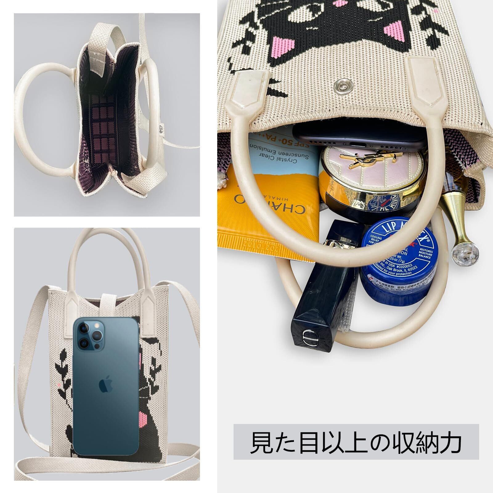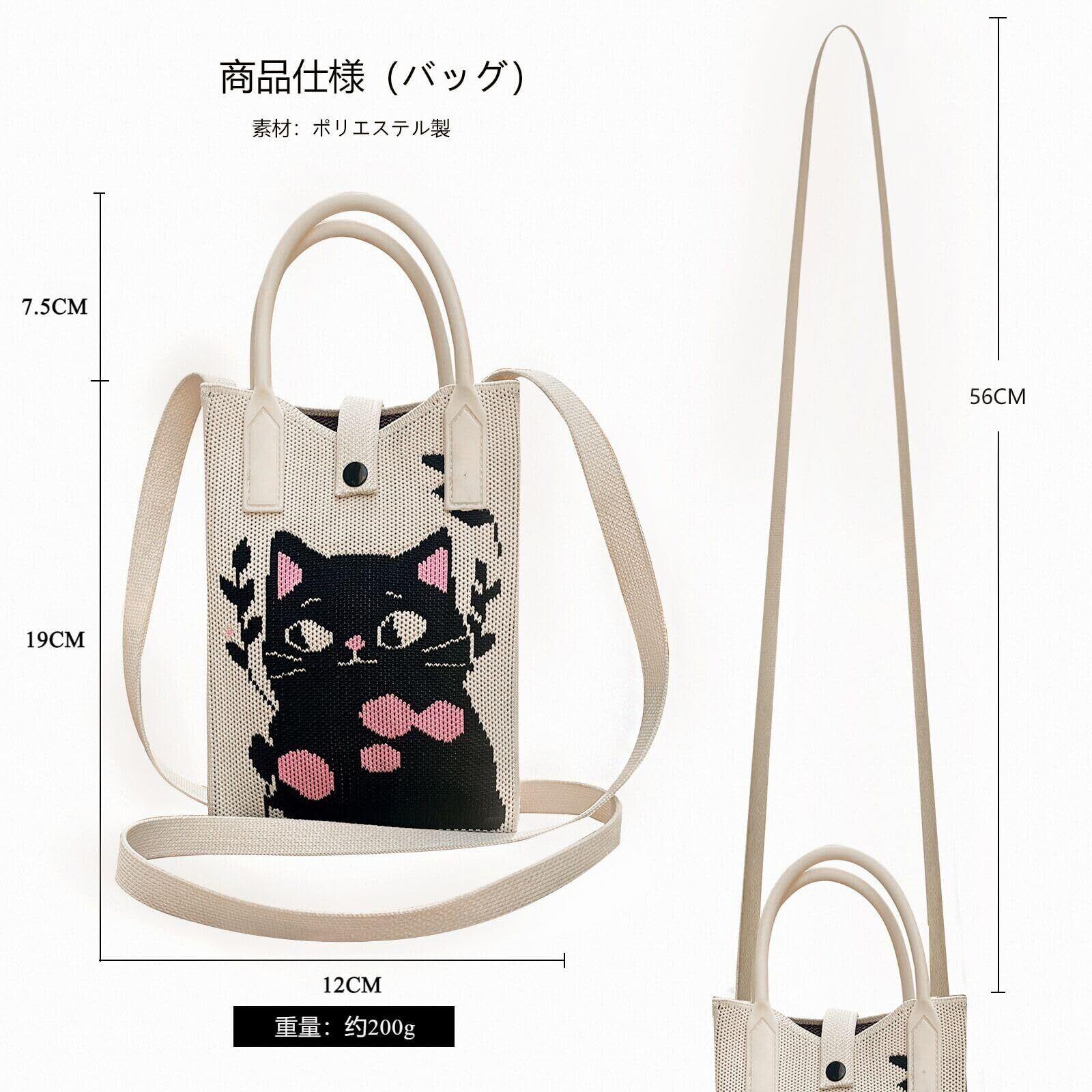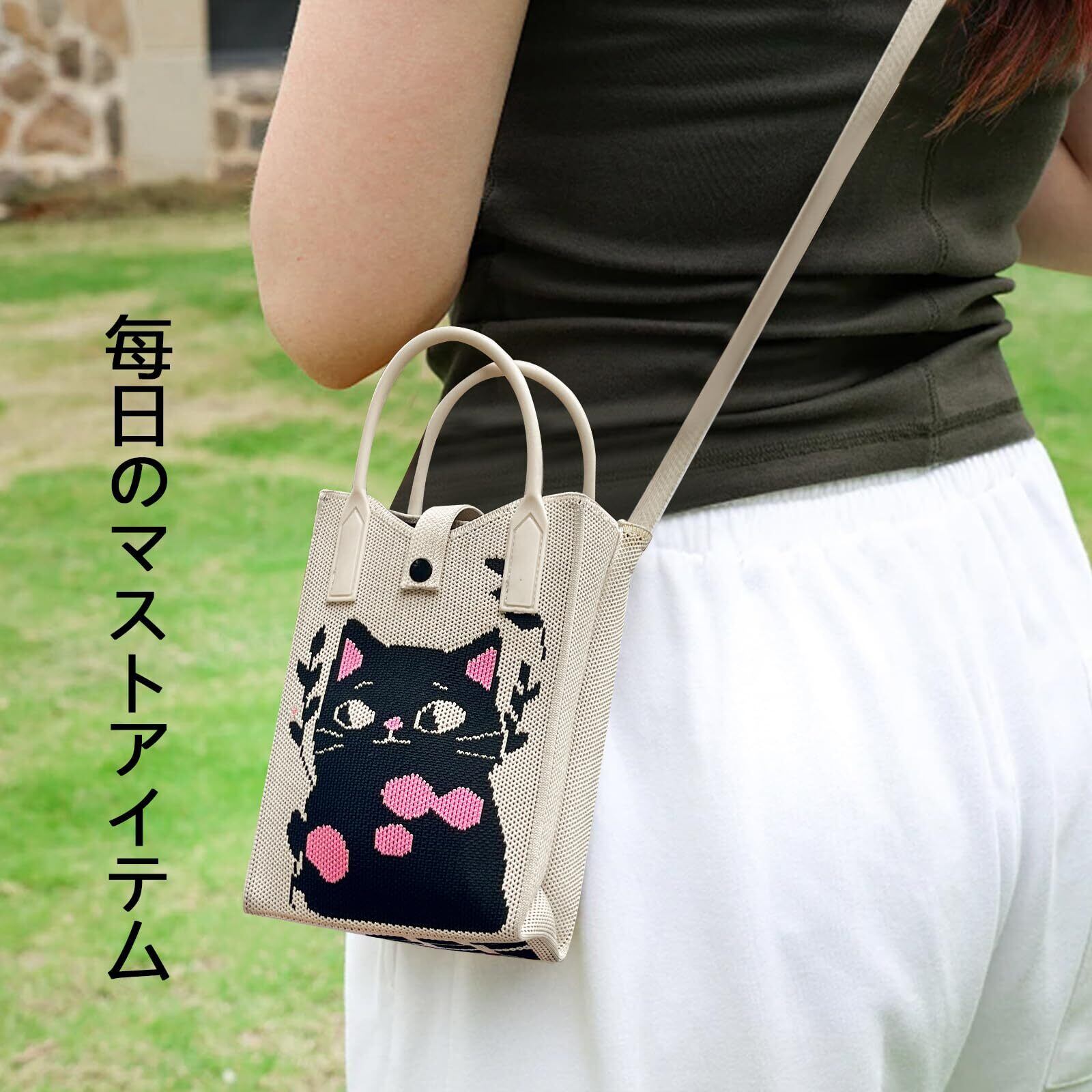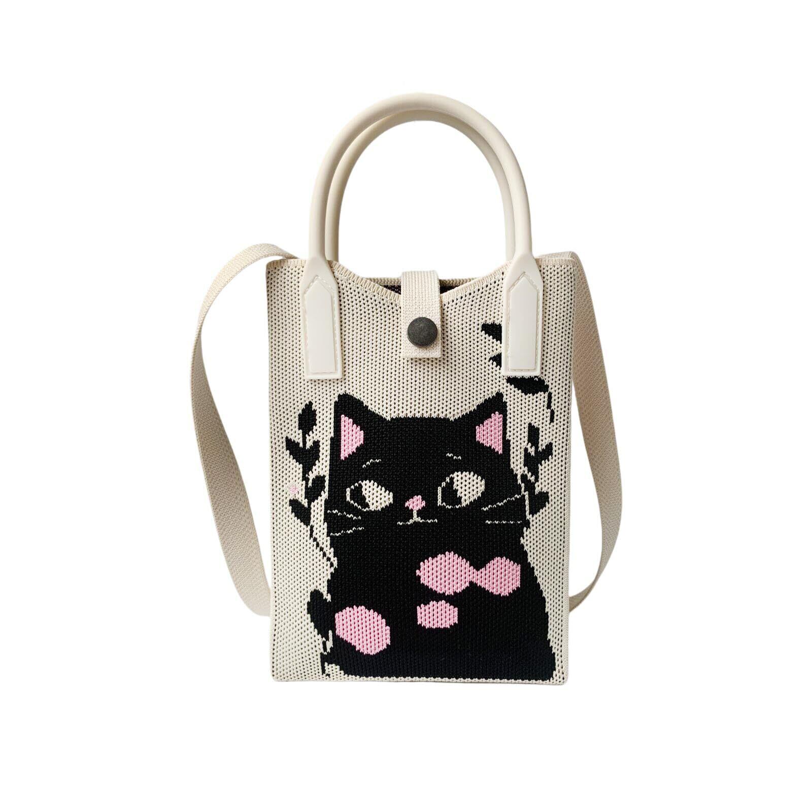 3wayの可愛い猫柄のお散歩バッグ。かわいい猫柄のニットミニバッグには肩掛けストラップと汚れにくいゴム手持ち付き。ポシェットとしてはもちろん、丈夫な小さな取っ手があることで取り出しやすい。