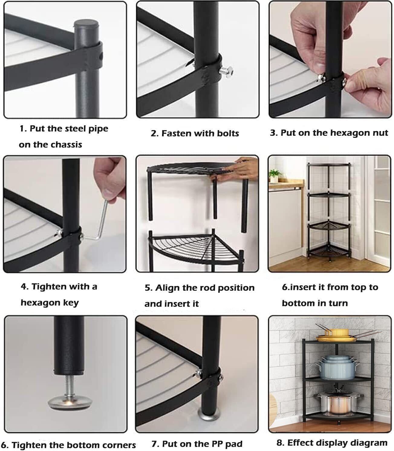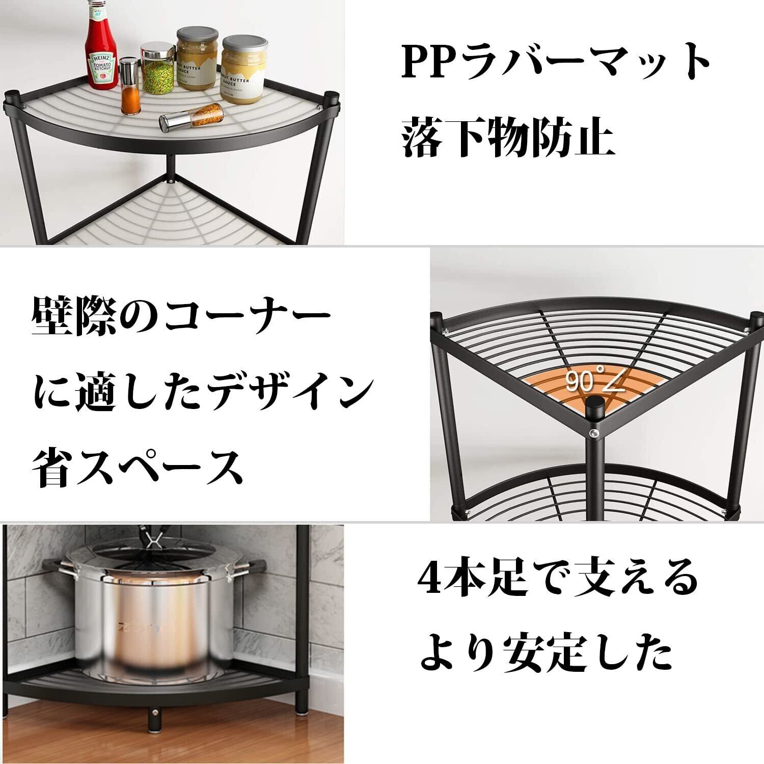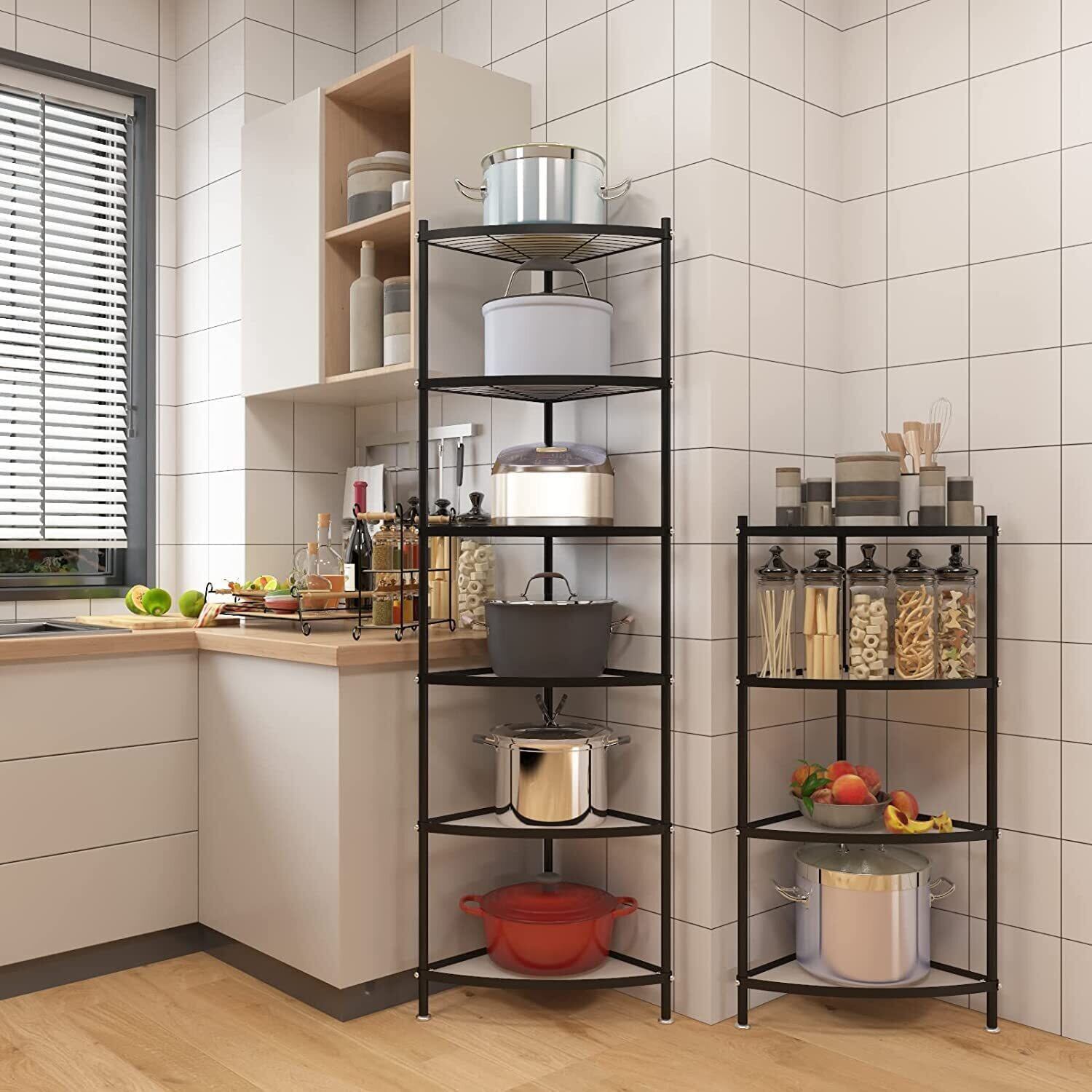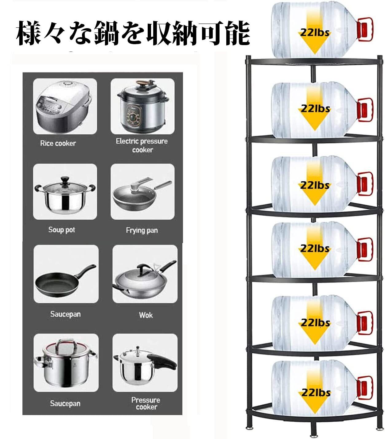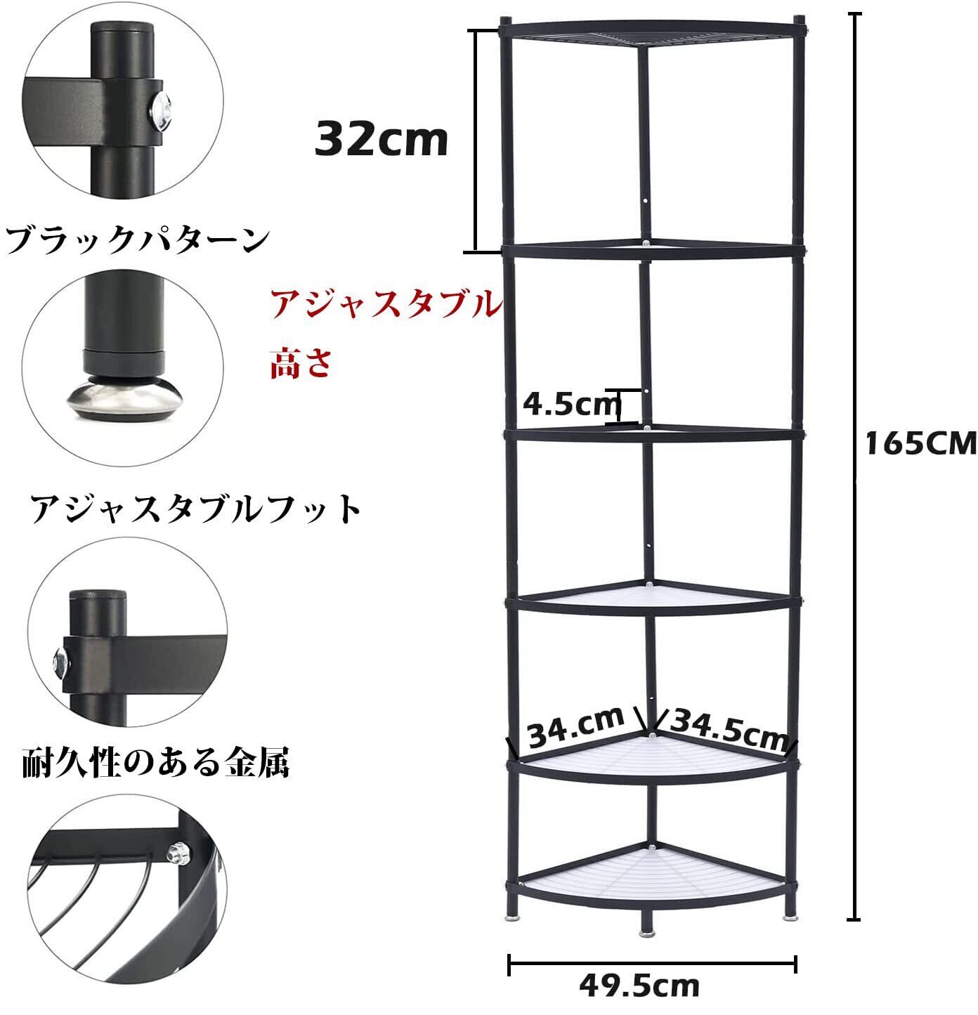 キッチンコーナーラック 6段 角が丸い キッチンシェルフ 幅49.5cm 高さ165cm 炭素鋼 収納シェルフ 三角 扇形コーナー棚 キッチン お鍋ラック 角棚
