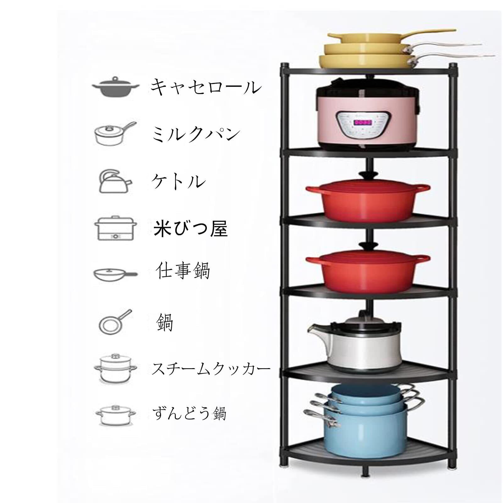 重い日用品やキッチン用品を収納できる6段のコーナーシェルフ 鍋・フライパンラック、ディッシュラック、野菜・果物ラックでキッチン用品を効率的に整理できます。