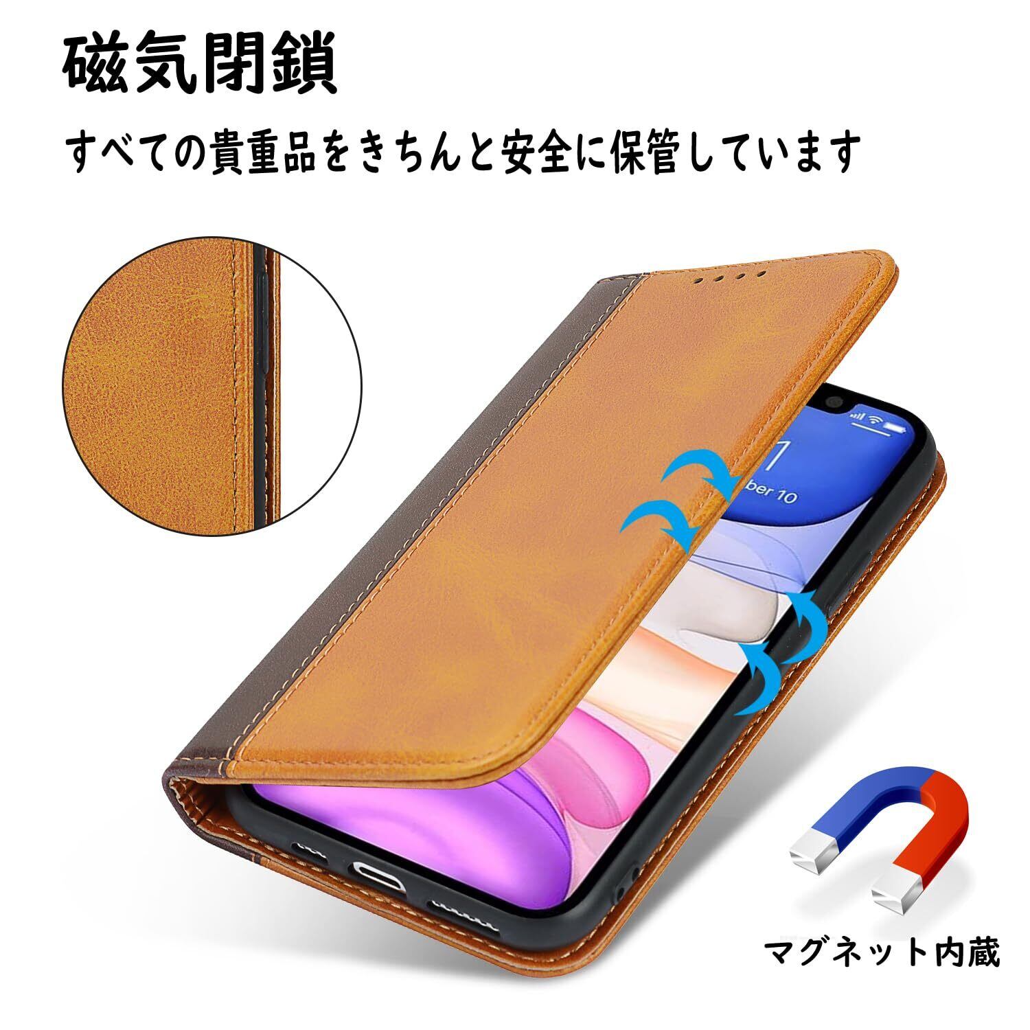 【収納機能】iPhone11ケース内側には三つのカード入れとフリーポケットがつき、カード類や紙幣、名刺などが収納できます。カードスロットに2枚のカードを入れると、内蔵マグネットの機能を最大限に発揮し、カードが消磁されるのを防ぐことができます。横置きスタンド機能が付き、横向いて斜めに立てて、自由に角度を調整して、お好みの角度で動画鑑賞や読書などを楽しめます。長時間での新幹線、飛行機の中での暇つぶしに最適です。