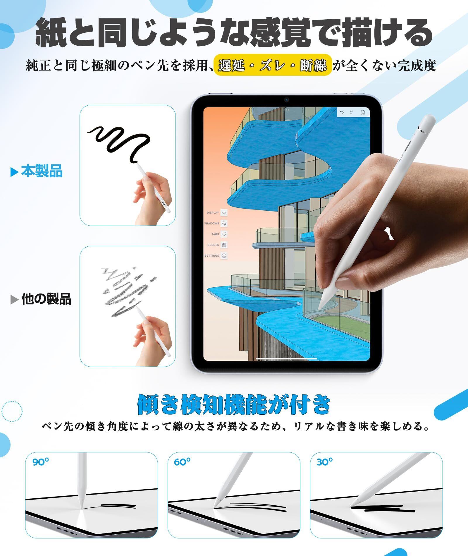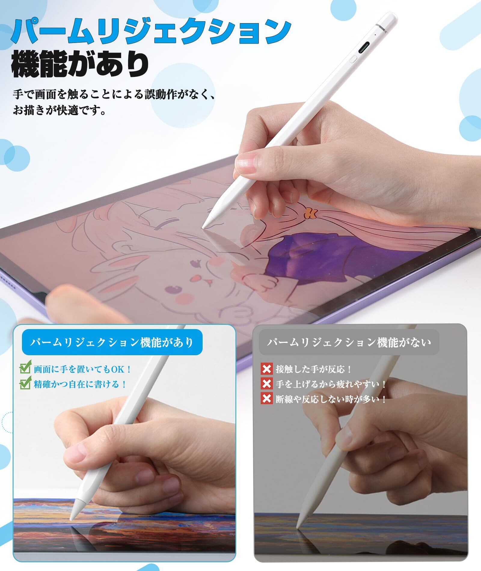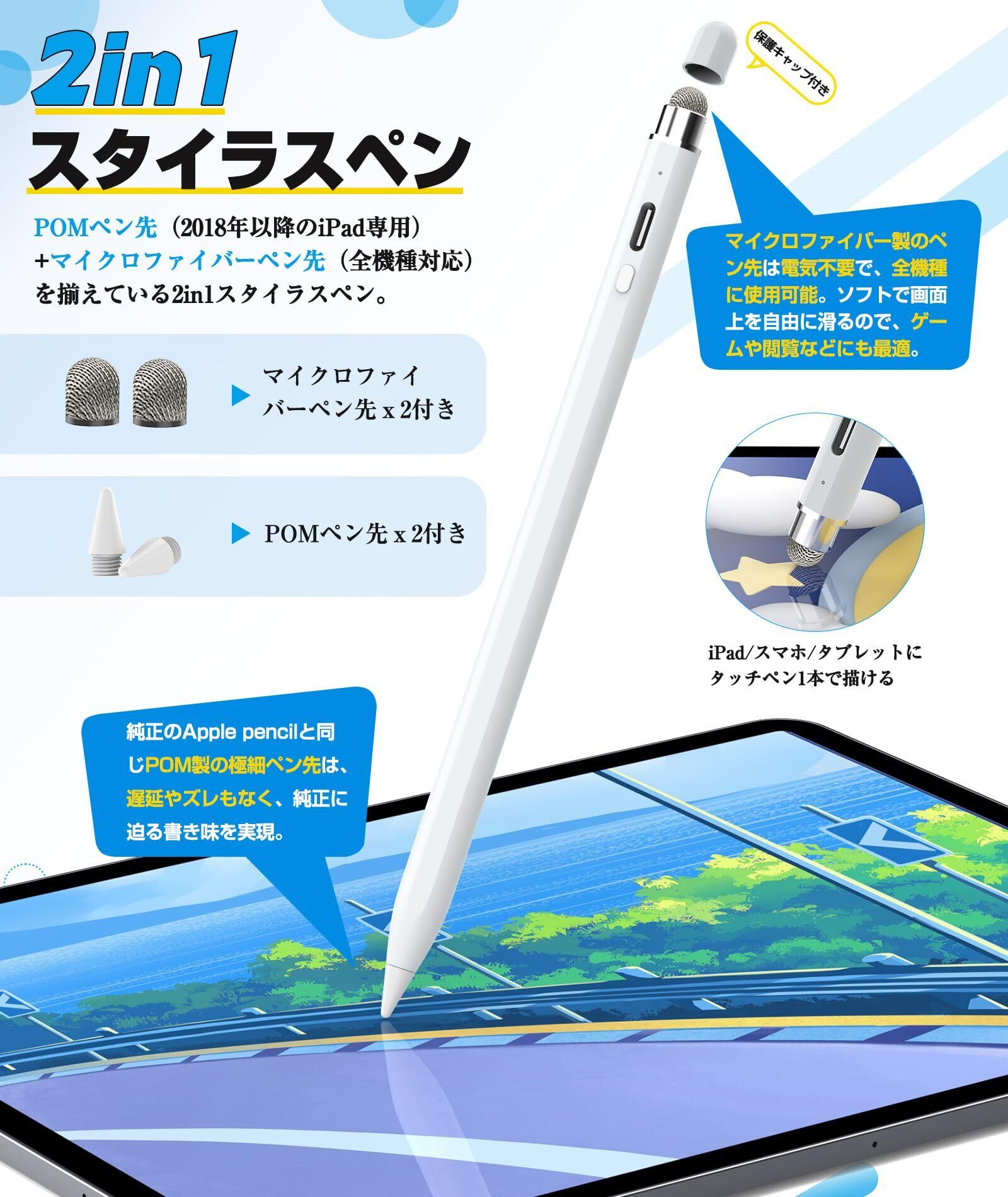 タッチペン iPad ペン【2023年最新型 POMペン先/導電繊維ペン先 2in1】 スタイラスペン 高感度 高精度 傾き感知 磁気吸着 パームリジェクション付き USB-C充電式 iPad/iPad Air/iPad mini/iPad Pro 2018年以降iPadに対応