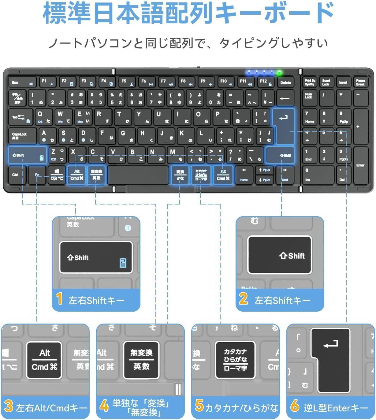 【革新進化版・逆L型Enter・左右shiftキー搭載】Omikamoはお客様からいただいたお声をもとに、進化版ワイヤレス折り畳みキーボードを開発しました!逆L型Enter、左右shiftキー、左右Altキー搭載、また18mmのキーピッチで、お客様により快適にタイピングできます。