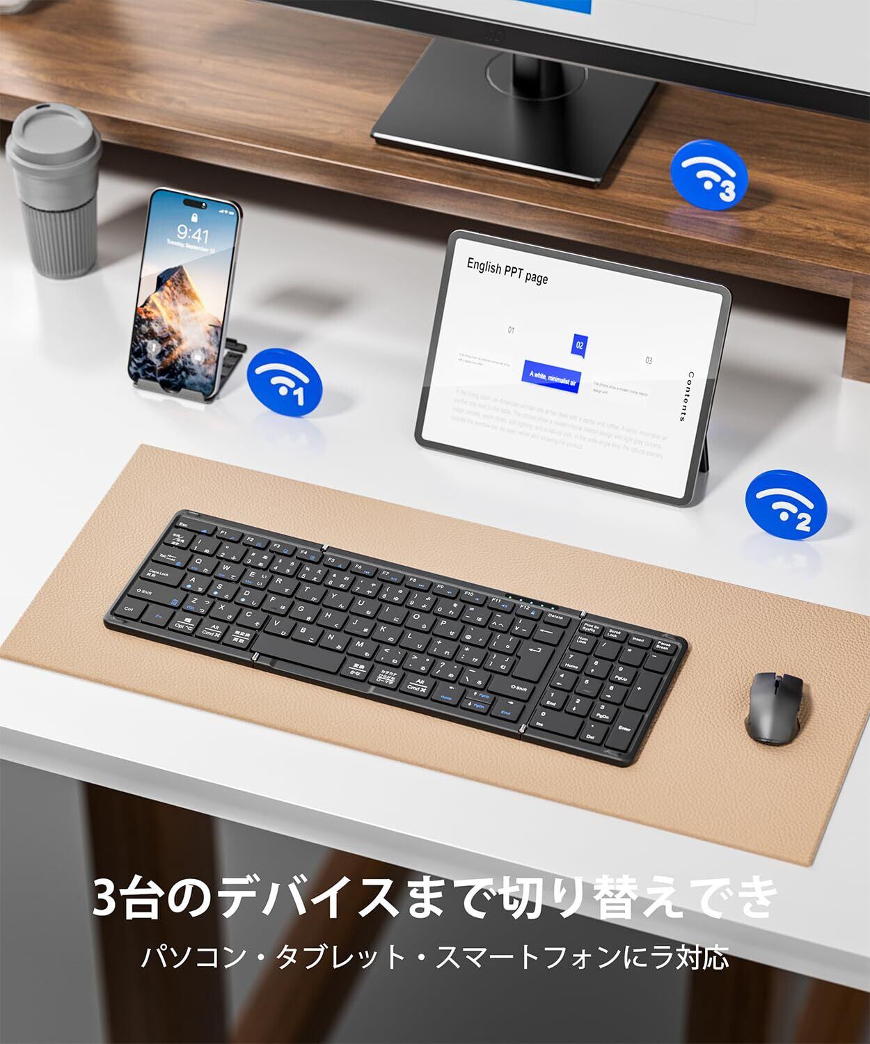 【折りたたみ式 キーボード テンキー付き】三つ折り式で外出先へ携帯する場合はバッグへ簡単に収納でき、持ち運び便利。また、大型テンキー付き、数字や記号をスムーズに入力しやすくなり、作業効率が確実に上がります。Excelや電卓アプリ、会計ソフトなどを使い数字を入力する機会が多い方に最適です。