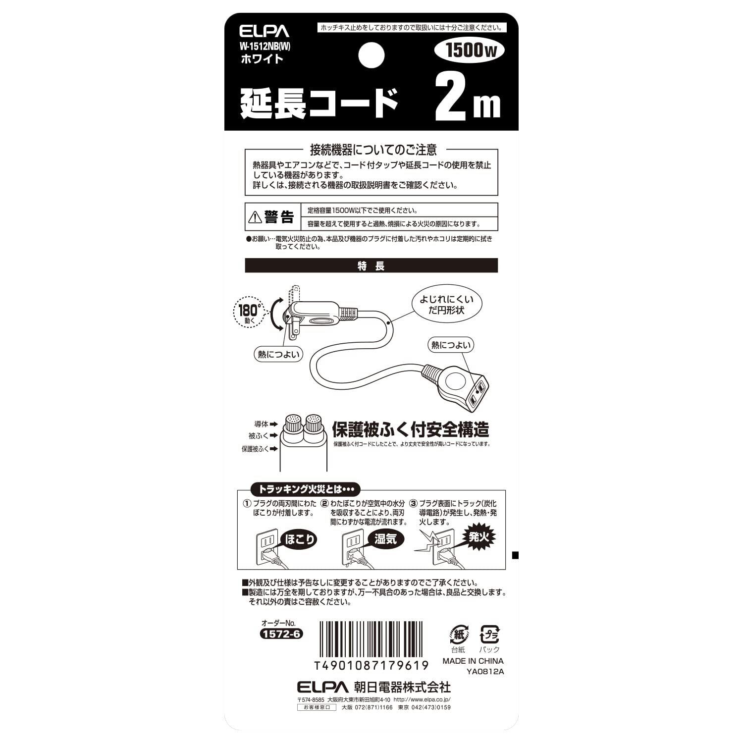 エルパ (ELPA) 延長コード メス-オス (2m / スイングプラグ/耐トラッキングカバー) W-1512NB(W) ホワイト