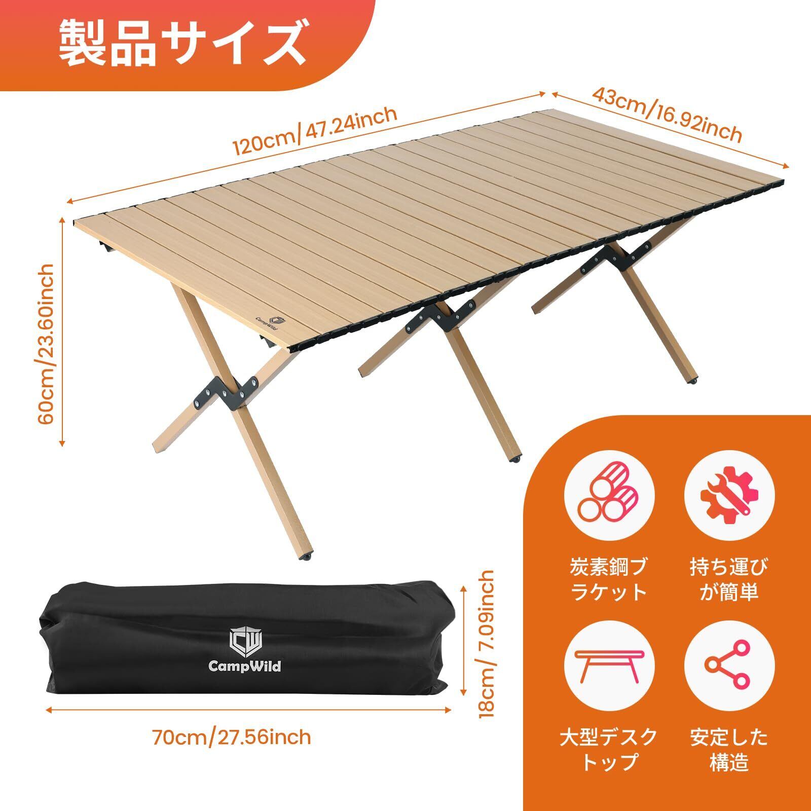 便利で多機能なデザイン:この折りたたみ式キャンプテーブルは、幅120cm、長さ60cm、高さ45cmというサイズで、アウトドアキャンプやハイキング、バーベキューなどの屋外アクティビティだけでなく、室内のダイニングテーブルやパーティーでも活躍します。屋外の自然環境でも、屋内の快適な場所でも、様々な用途で利用できます。