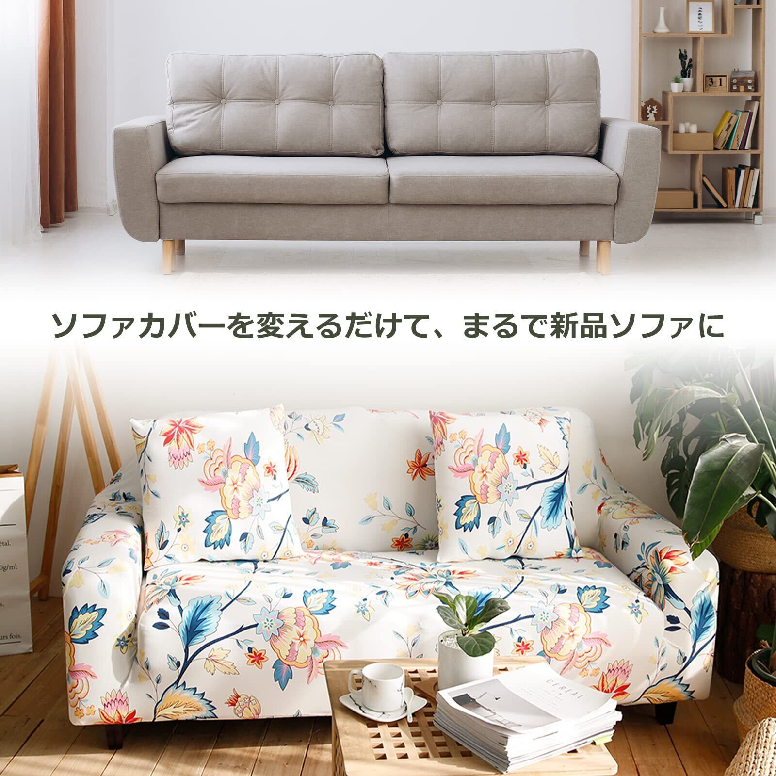 【装着簡単】春夏秋冬全シーズン通用、どんなソファーにもフィット、伸縮するストレッチ素材を使っている装着簡単なソファーカバーです。女性の力でも簡単に取付られ、お部屋の模様替えが簡単に出来ます。