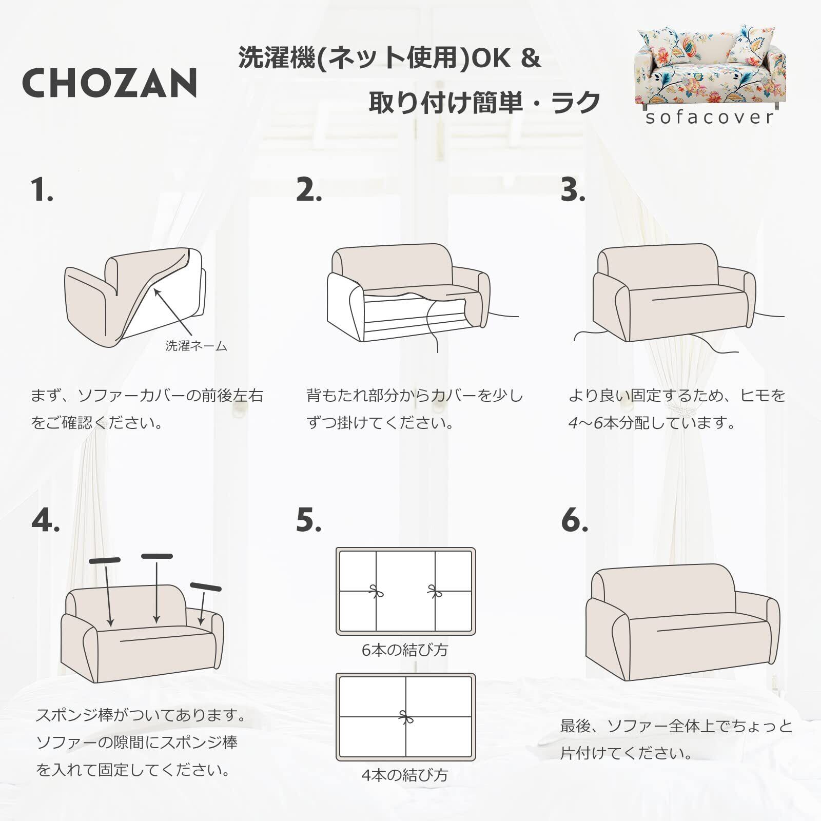 【サイズ】1人掛け:90-140cm、2人掛け:145-185cm、3人掛け:190-230cm、4人掛け:235-300cm, パッケージにあるもの:ソファーカバー、クッションカバー2枚付 、スポンジ棒。