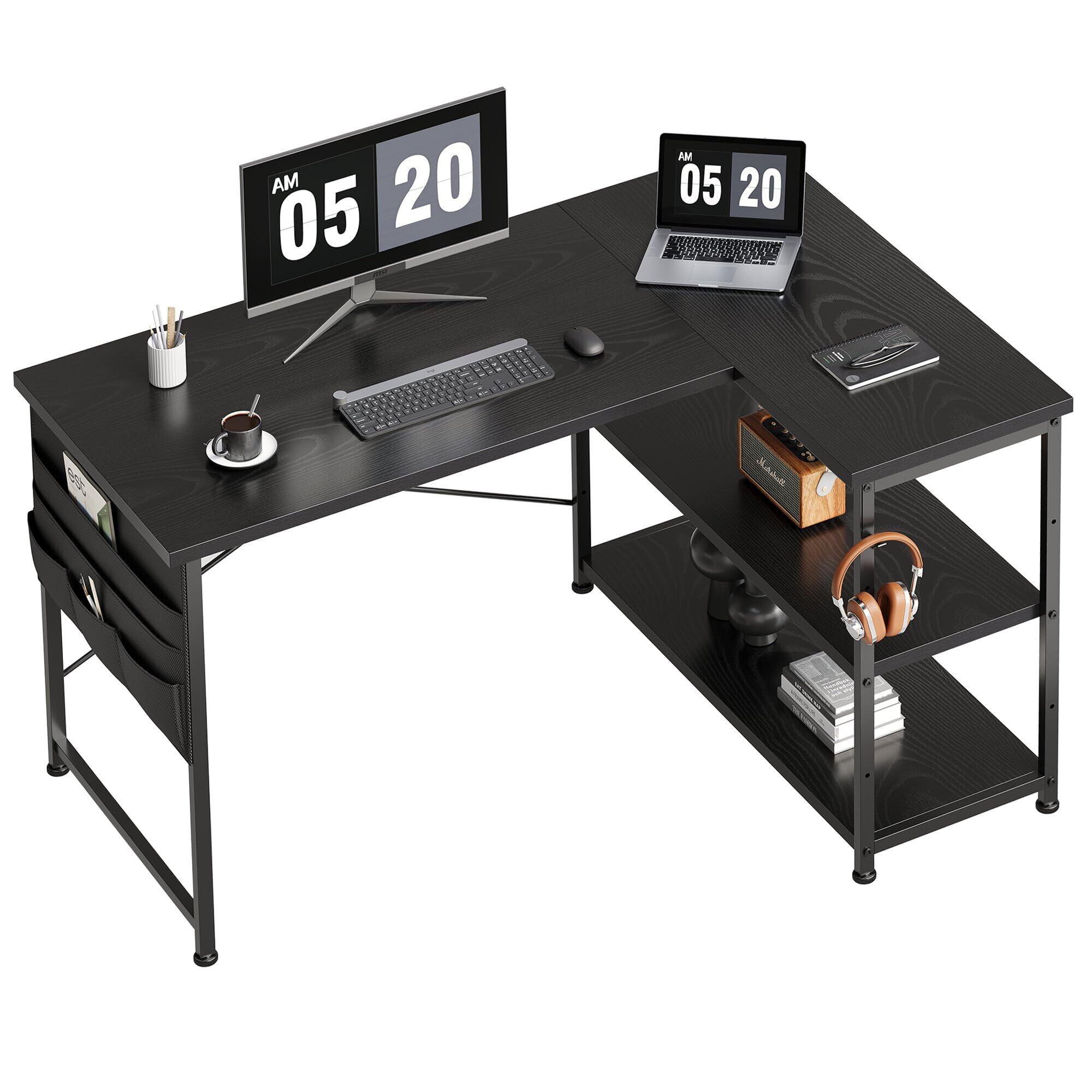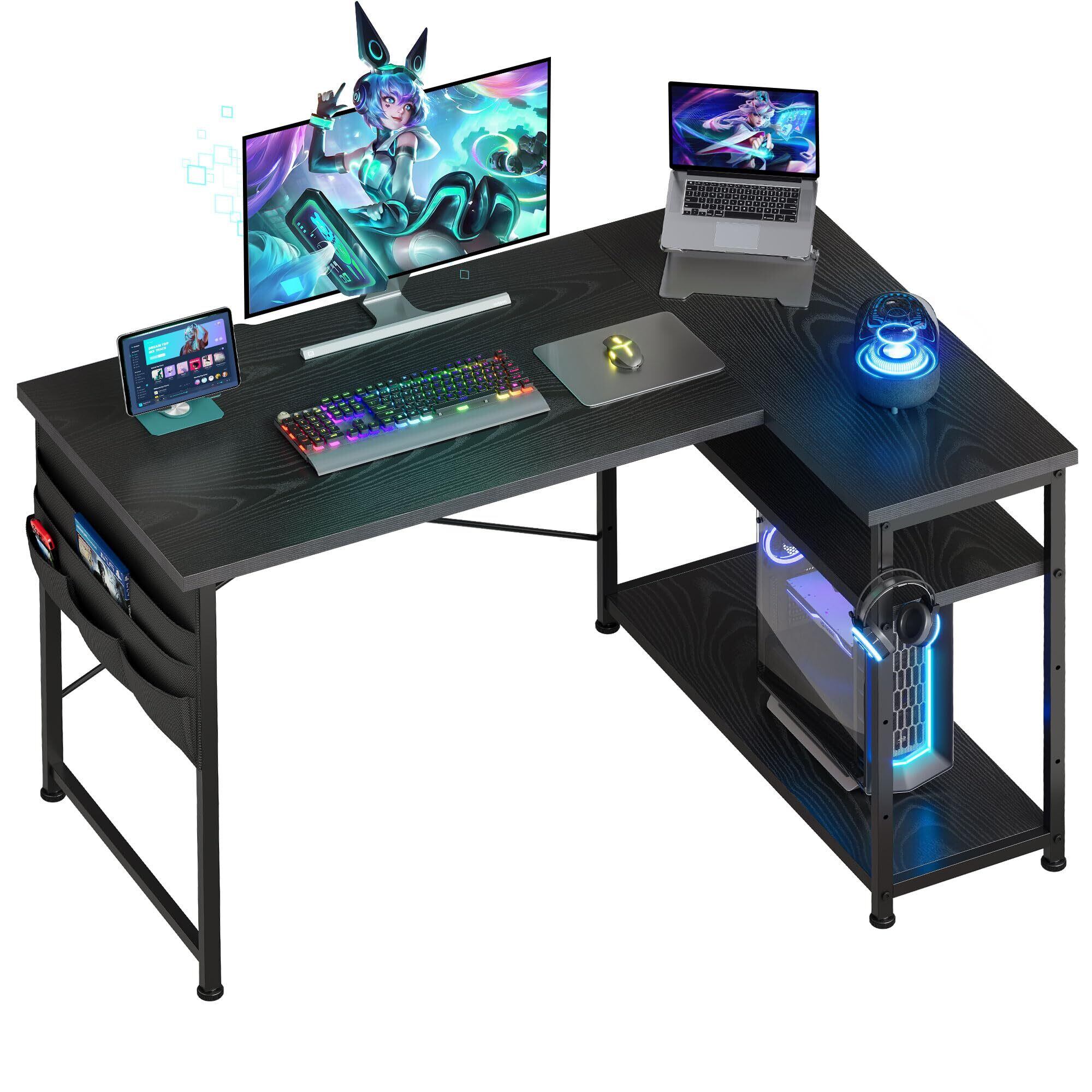 ゲーミングデスク l字デスク pcデスク 右棚左棚 幅107cm ゲーミングテーブル 収納袋付きオフィスデスク ゲームデスク ゲーミング机 つくえ ライティングデスク 黑い