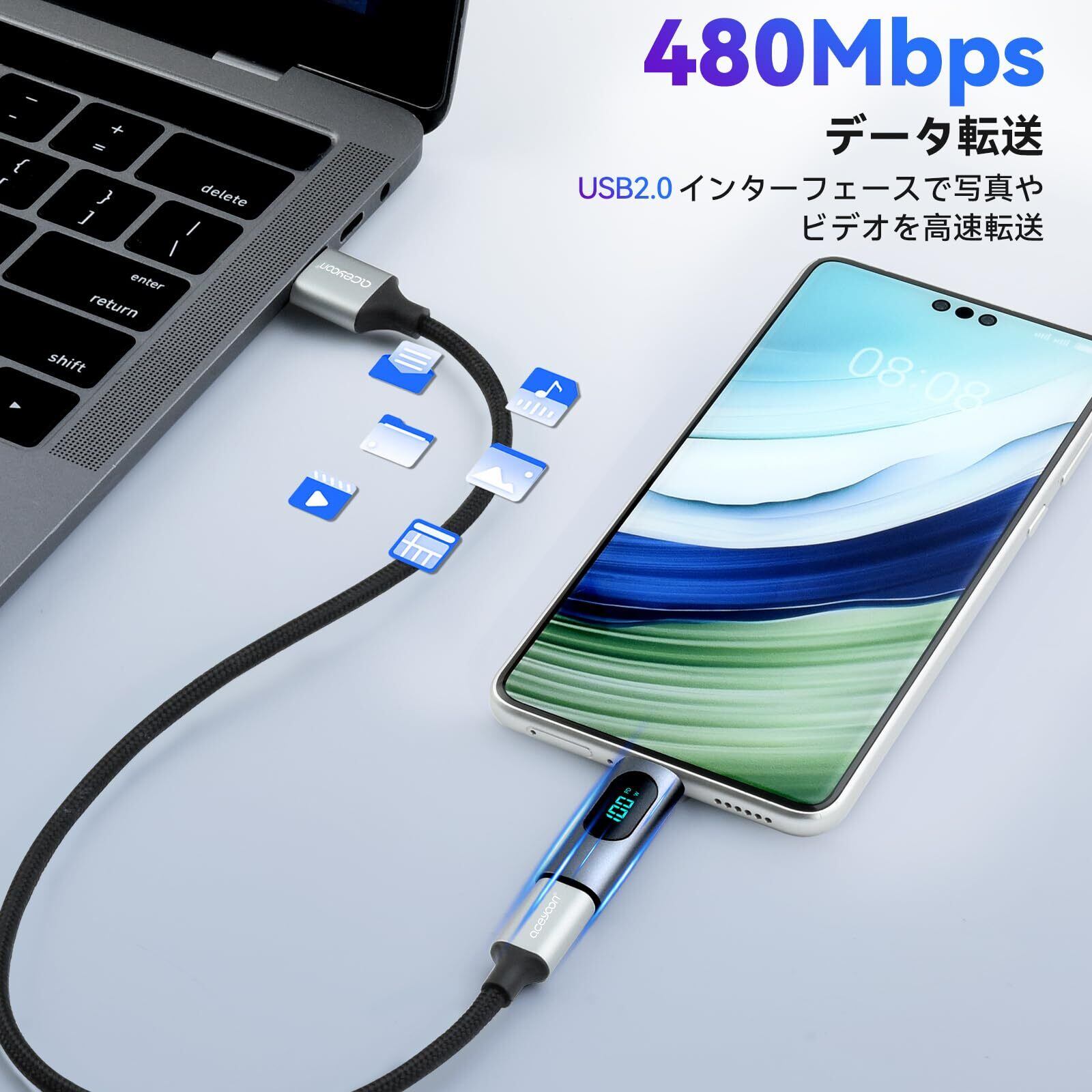 aceyoon USB C 電力表示アダプター 最大100W LEDディスプレイ付き 液晶 メス オス Type C OTG アダプタ 出力スクリーン PD急速充電 ワットチェッカー 電流表示 電力量が見える 480Mbpsデータ転送 タイプC for iPhone 15/Pro/Plus/ProMax、for MacBook USB C Adapter LED