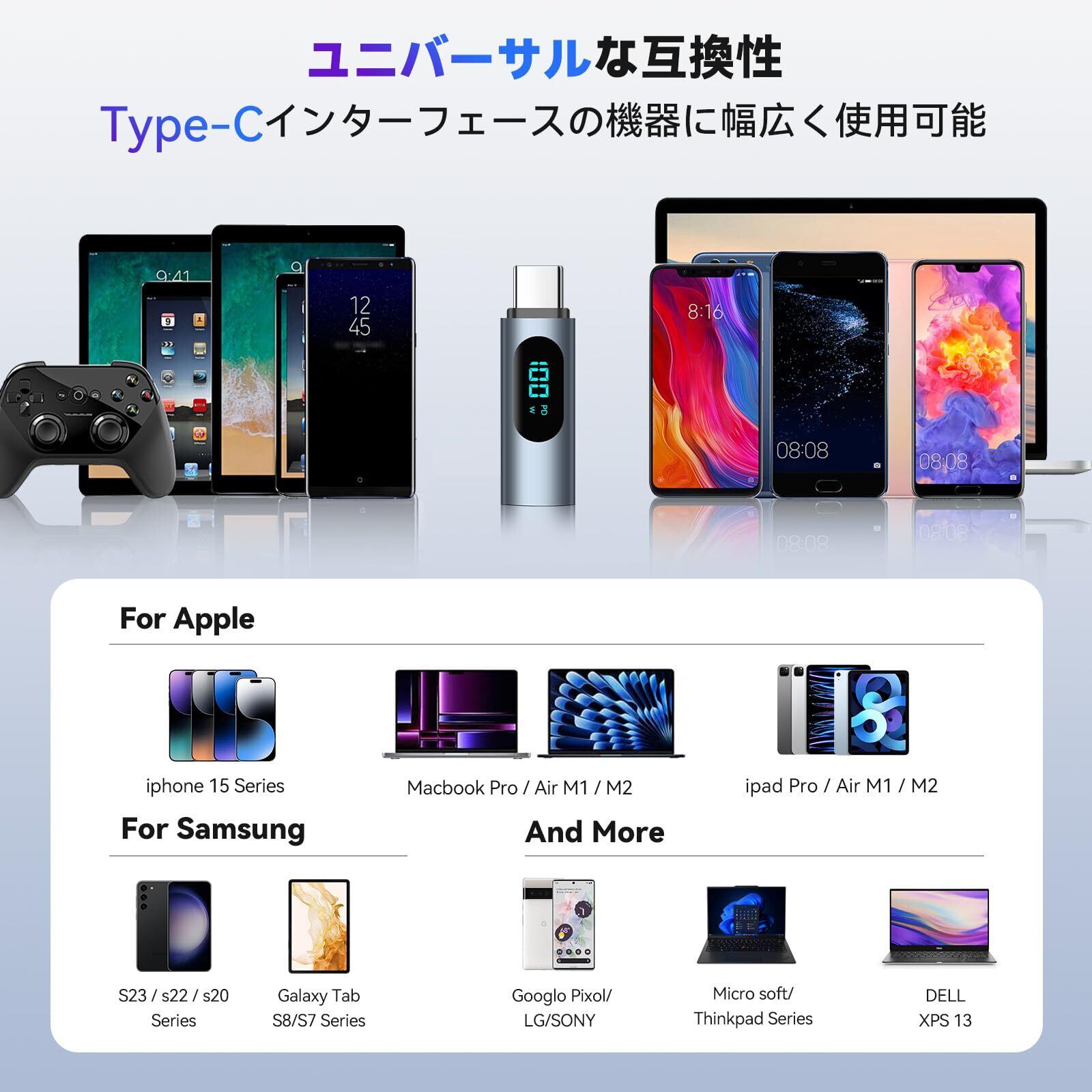 【幅広い互換性】このUSB C 100W アダプタ は多くのUSB Cデバイスと互換性があり、例えばfor iPhone 15/15 Plus/15 Pro/15 Pro Max、for MacBook Air/Pro、for iPad Mini/Pro/Air、for Galaxy S23 Ultra/S23+/S23/S22+/S22/Z Fold/Z Flip、for Google Pixelシリーズ、for Steam Deckなどに適しています。