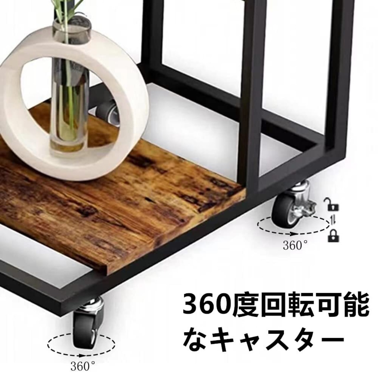 1.【移動に便利】サイドテーブルを移動させたい場合には、便利な4つのキャスターが付属しています。2つのキャスターはロック可能で必要な位置に固定することができます。