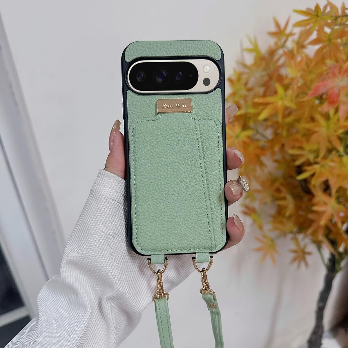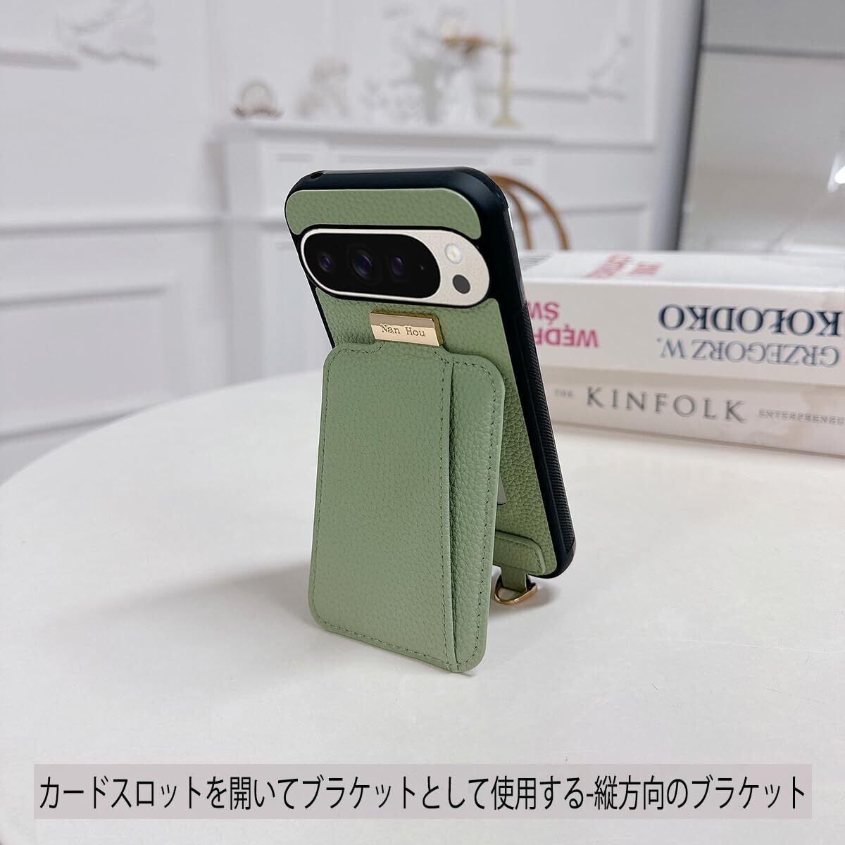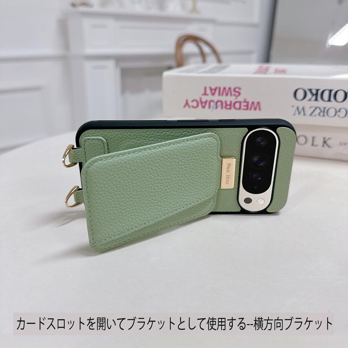 Google Pixel 9/9 pro ケース 手帳型 高質PU ファッション手帳型 斜めショルダーストラップ付き(長さ調整可能)耐衝撃 保護 Google 9/9pro カバー 内蔵 自吸式開閉 マグネット 背面鏡付き 人気 携帯カバー 女性 上品 カードポケット スタンド機能 リストバンド グーグルピクセル 9/9 pro ケース - ライトグリーン