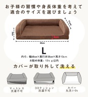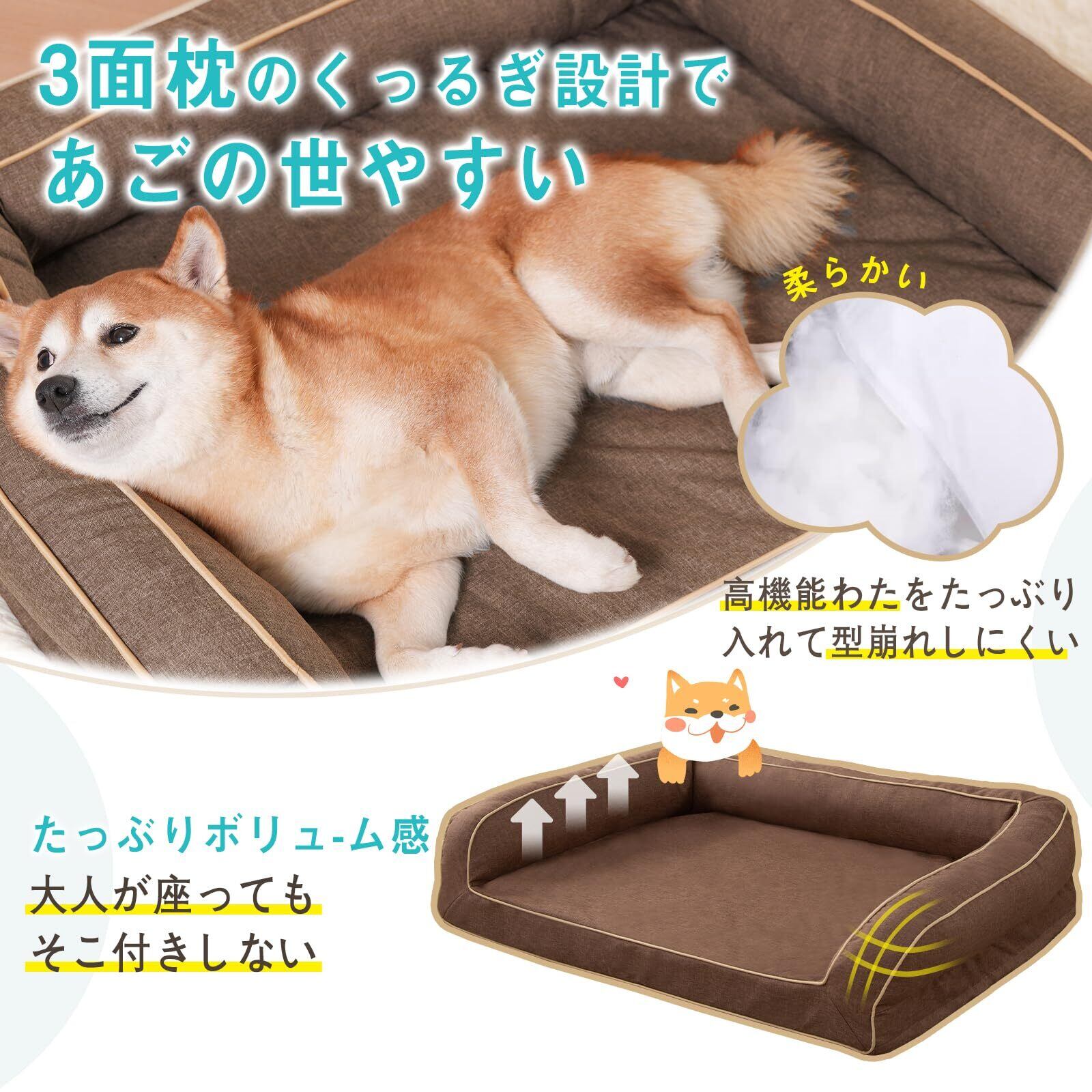 【3面枕付きで快適な居心地】 柔らかな壁面にすっぽり包まれるソファ型の犬ベッド。 ペットベッドの枕部分は抗菌防臭加工済みの中綿を使用し、 衛生的でイヤなニオイを防げます。中綿をたっぷり入れており、ふわふわな触感を楽しめ、 あご乗せやすくゆったり過ごせます。さらに3面に枕付きで仰向けも横向けも、 どんな寝相でもぐっすり眠れます。低めな入り口設計で、高齢犬も楽々に出入りができます。
