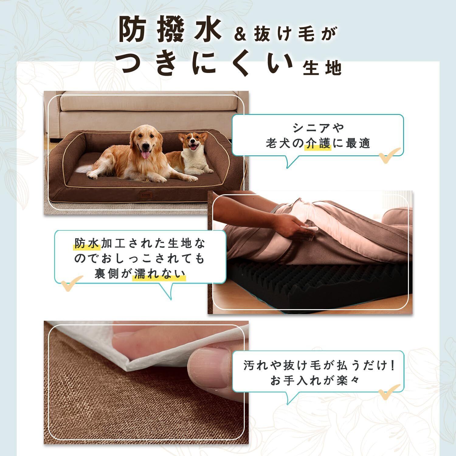 【お手入れが簡単な防水機能】 本品の犬ペットベッドは生地の裏面に防水膜があり、濡れても下まで浸透することがありません。 軽くておもらしも安心、防水機能の快適ベッド。抜け毛は払うだけ!お掃除完了! 【ゆったり大きめサイズ】 ゆったりとしたサイズ感なので大型犬の子や多頭飼いのお家にもオススメです。