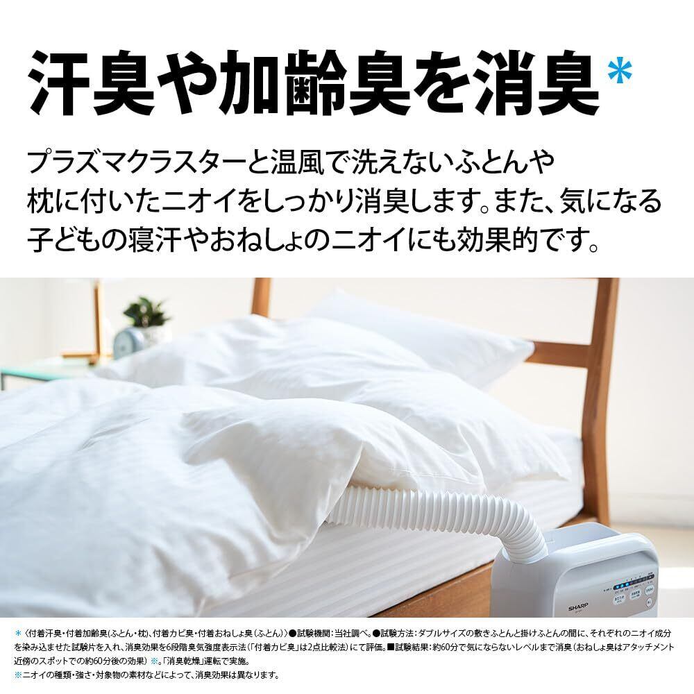 プラズマクラスターと温風でダブルサイズのふとんまでダニ対策ができます。プラズマクラスターと温風でふとんや洗えない枕に付着したニオイをしっかり消臭します。また、気になる子どもの寝汗やおねしょのニオイにも効果的です。