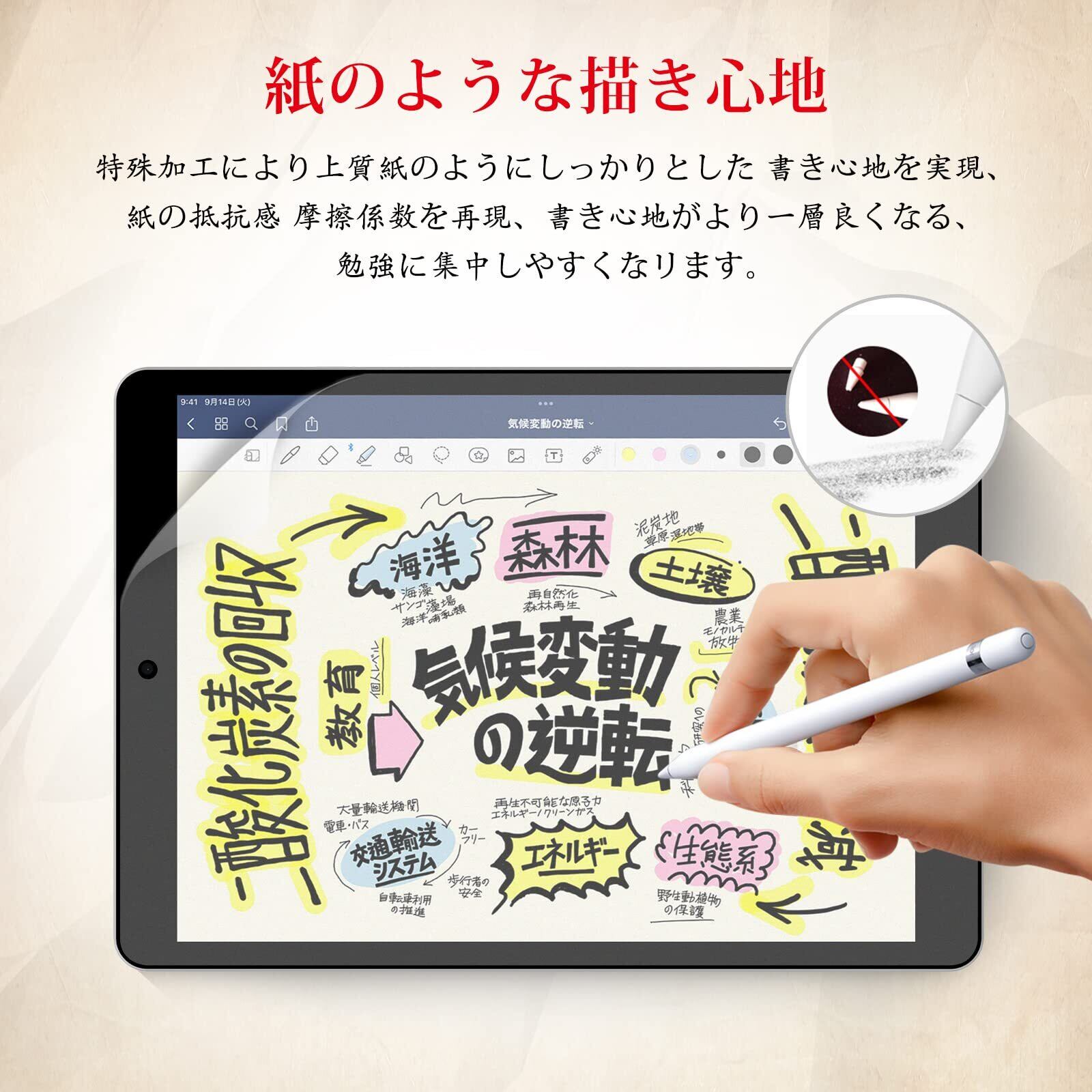 【ケント紙のような描き心地】iPad 9世代 ペーパーフィルムは日本からの高密度素材を採用し、適度な摩擦と抵抗力があり、文字やイラストなどを書き込む際に滑りにくく、紙のような質感を楽しめます。また、ペーパーフィルムはApple pencilと交換性があり、ストロークが滑らかでペン先磨耗も抑えられ、快適な書き心地を実現します。