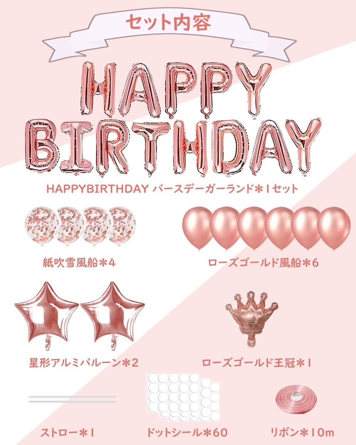 【輝くセット】誕生日バルーンセット内容:ローズゴールド紙吹雪バルーン×4個、ローズゴールドゴムバルーン×6個、Happy Birthday風船各文字×1セット、スターバルーン×2個、王冠バルーン×1個、ドットシール×2個、ローズゴールドリボン×10 m、 吸込管×1本