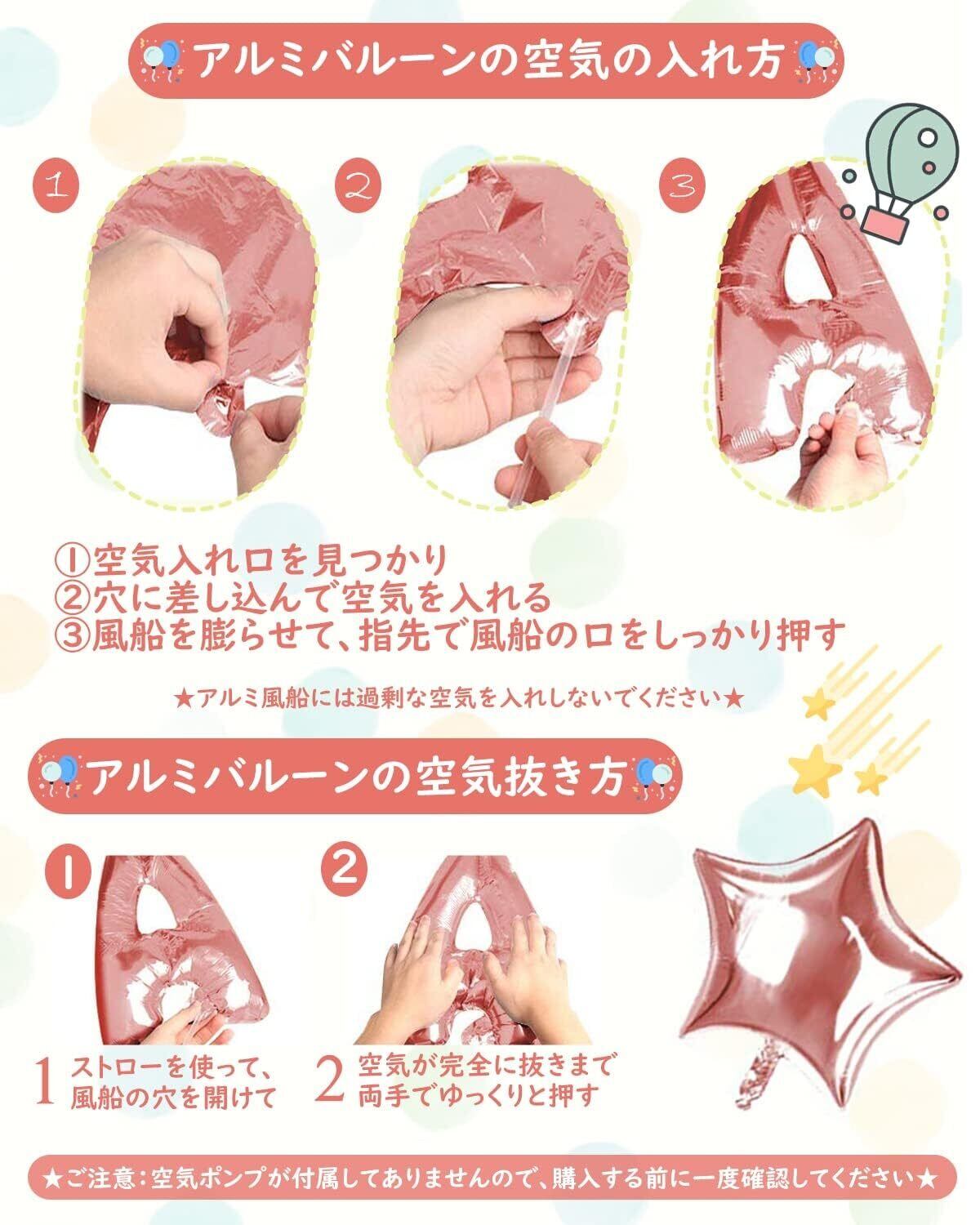 【ご注意事項と使用上のヒント】本製品の誕生日バルーンは装飾用です。風船 誕生日の使用時は、空気の入れ過ぎに注意し、少しずつ入れることをお勧めします。また、アルミバルーンは破裂しやすいので特に注意が必要です。結びリボンや壁に貼るテープも提供しており、どんな場所でも簡単に飾ることができます。