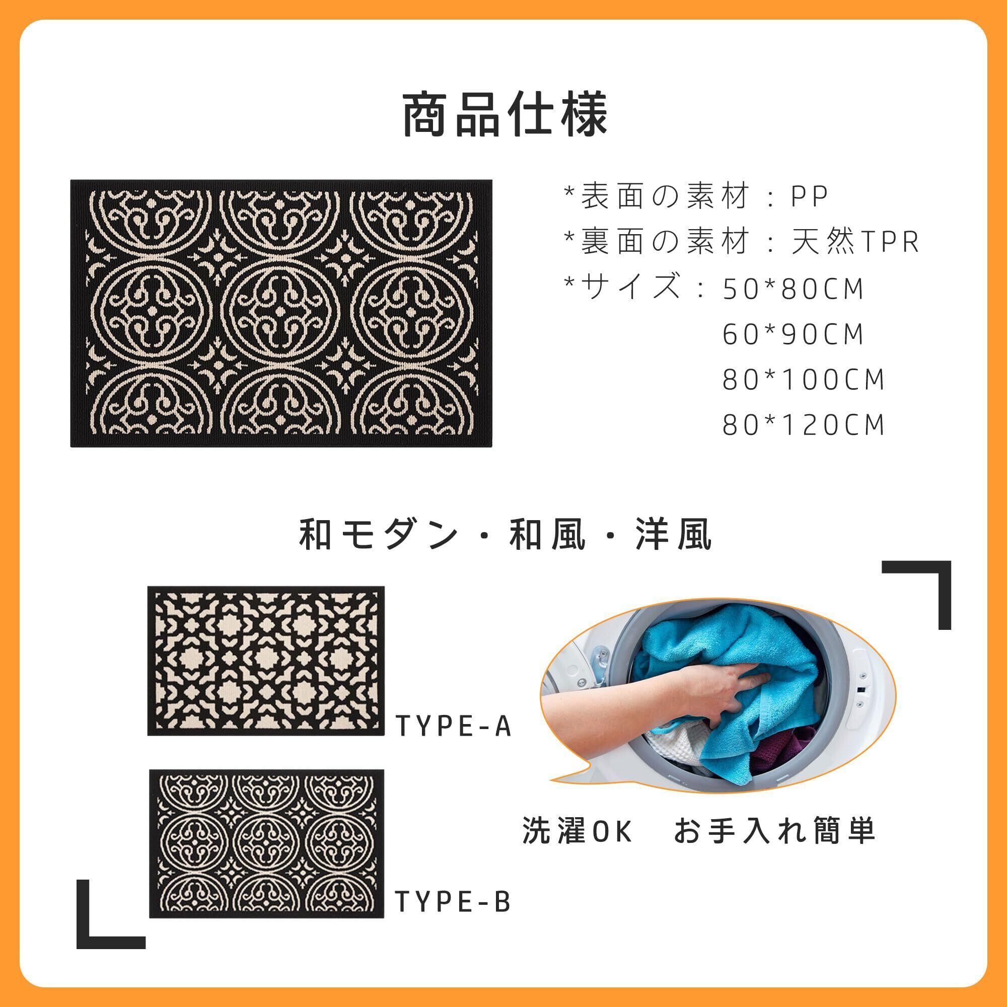 【耐久性・耐摩耗性 適度な厚さ】細かい縫い目きれいな編み方で作られており、優れた耐久性と耐摩耗性を持ちます。厚さ7mm、ドアを開く邪魔になりません。※厚いマットだとドアの開け閉めができなくなることもありますね。厚みは必ずチェックしましょう。50*80cm、60*90cm、80*100cm、80*120cmの4サイズから選べます
