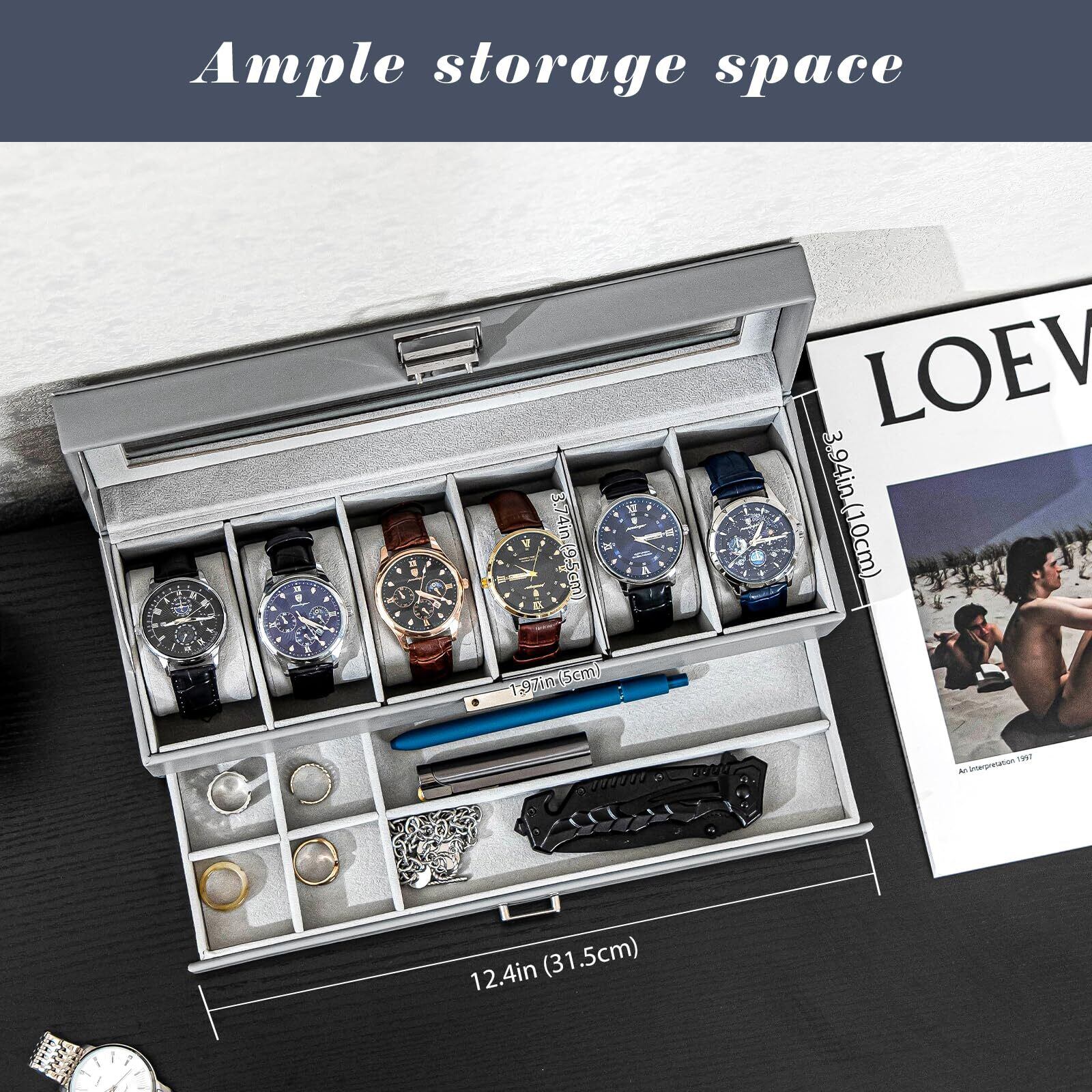 ProCase 腕時計ケース PU製 2段式 腕時計 メガネ 男性 アクセサリー 収納ボックス ガラス蓋 ディスプレイケース 小物整理 プレゼント-グレー