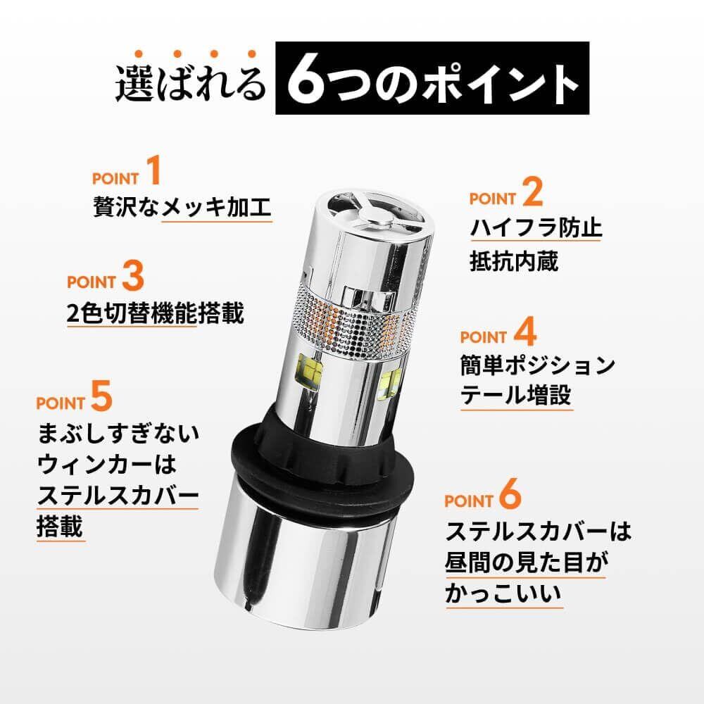 【選ばれる6つのポイント】①贅沢なメッキ加工②ハイフラ防止抵抗内蔵③2色切替機能搭載④簡単ポジションテール増設⑤まぶしすぎないウィンカーはステルスカバー搭載⑥ステルスカバーは昼間の見た目がかっこいい