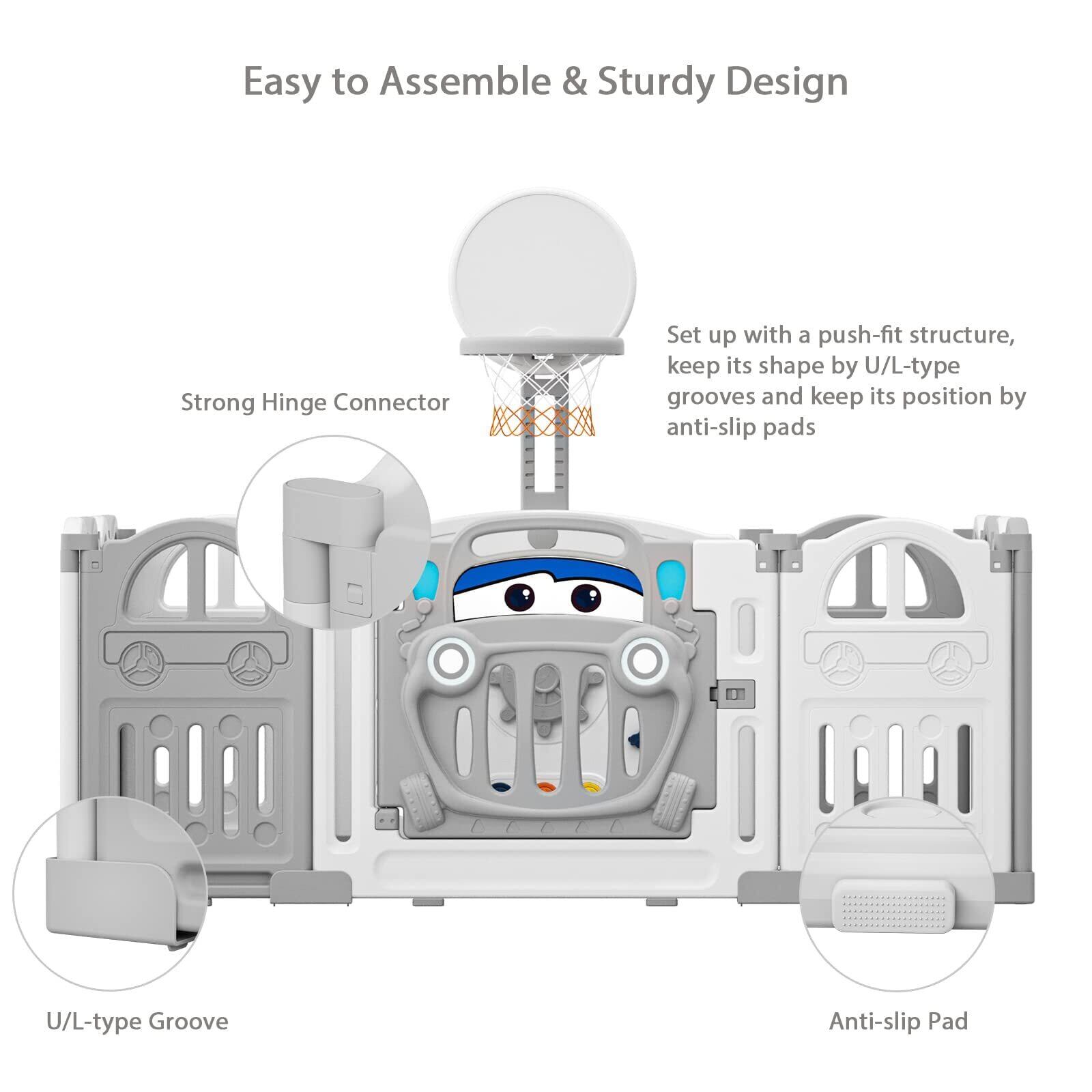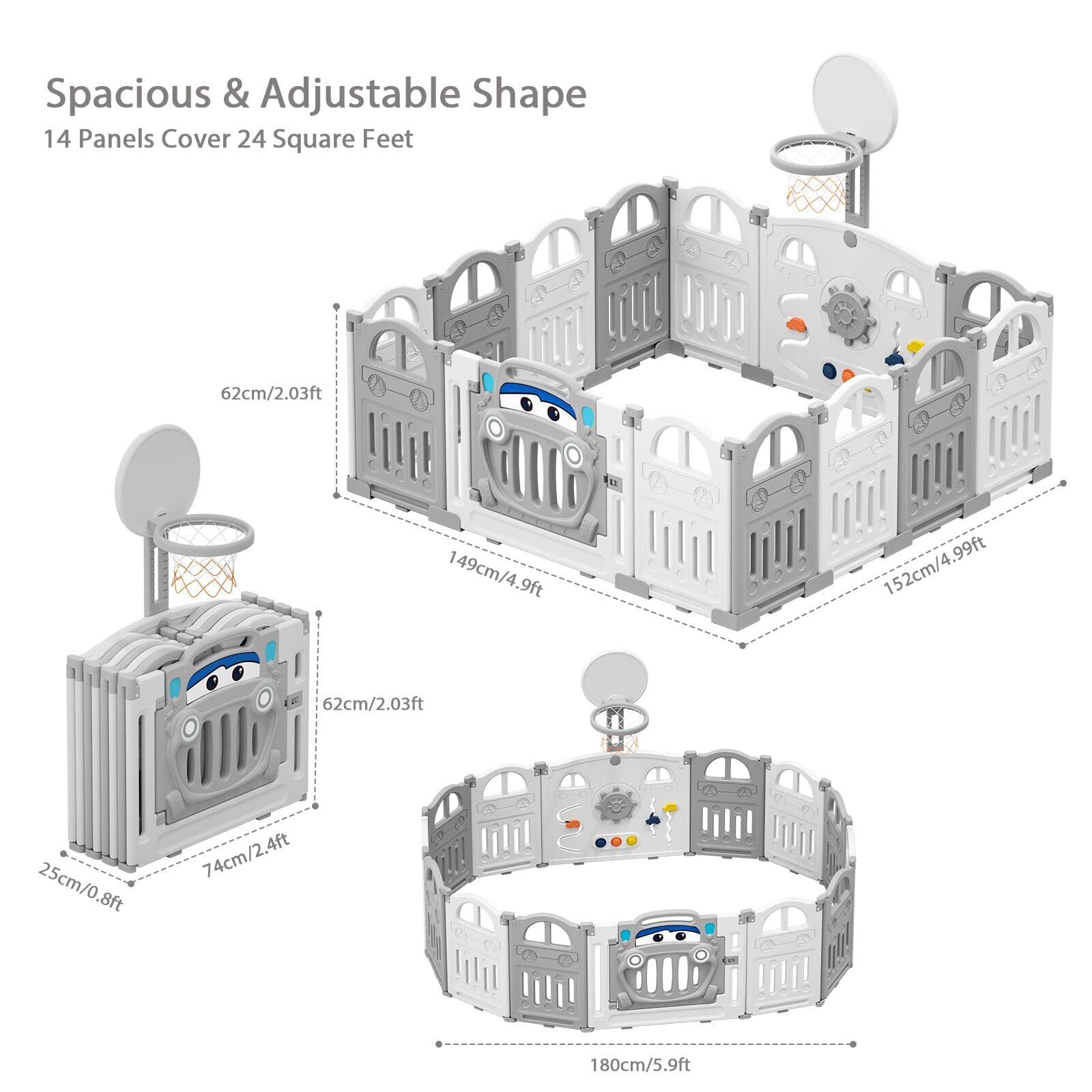 UBRAVOO ベビーサークル 折りたたみ 扉&おもちゃパネル・バスケット付 キッズランド プレイヤード 赤ちゃん 子供用 収納便利 長方形 正方形 自由調整 出産祝い (14枚パネル, グレー)