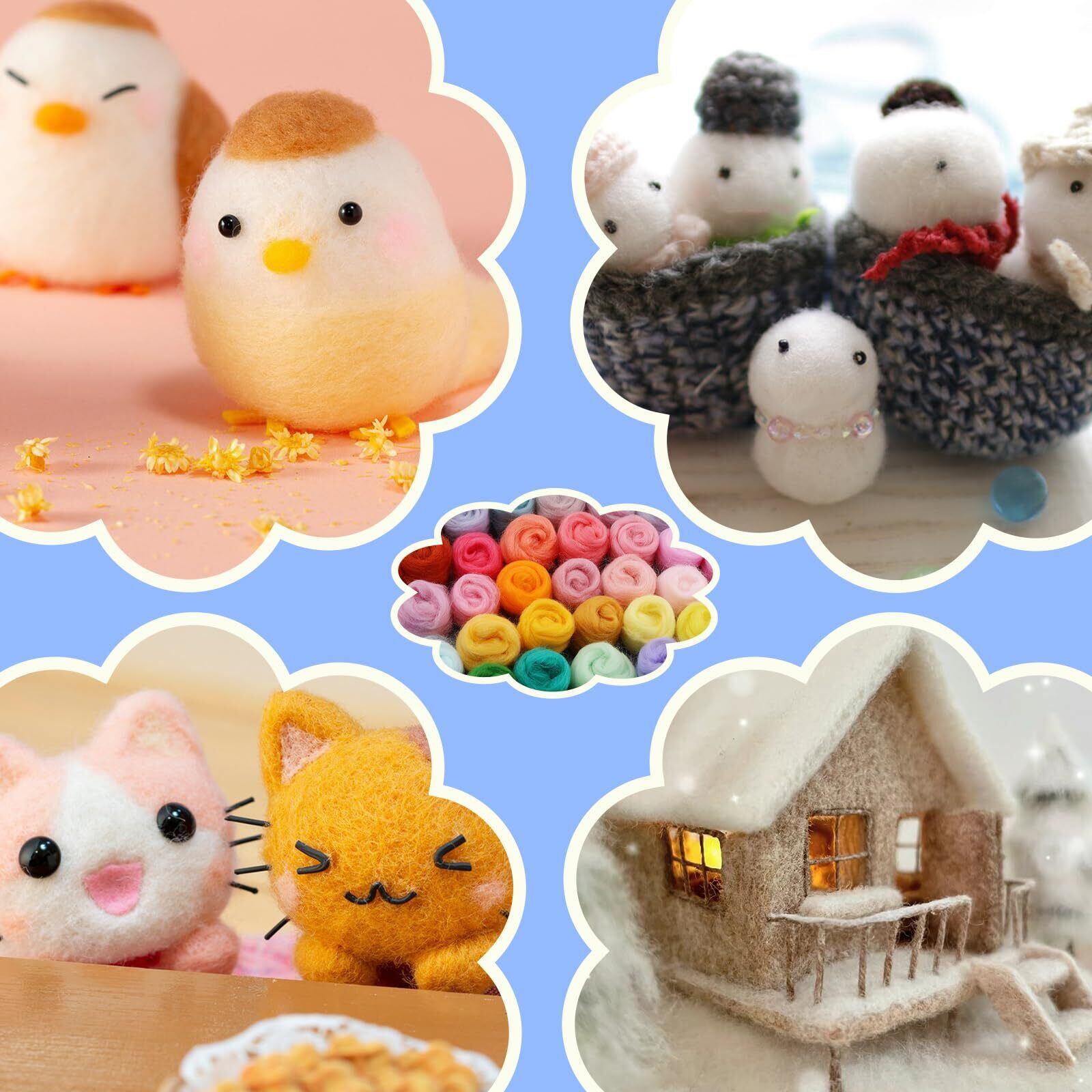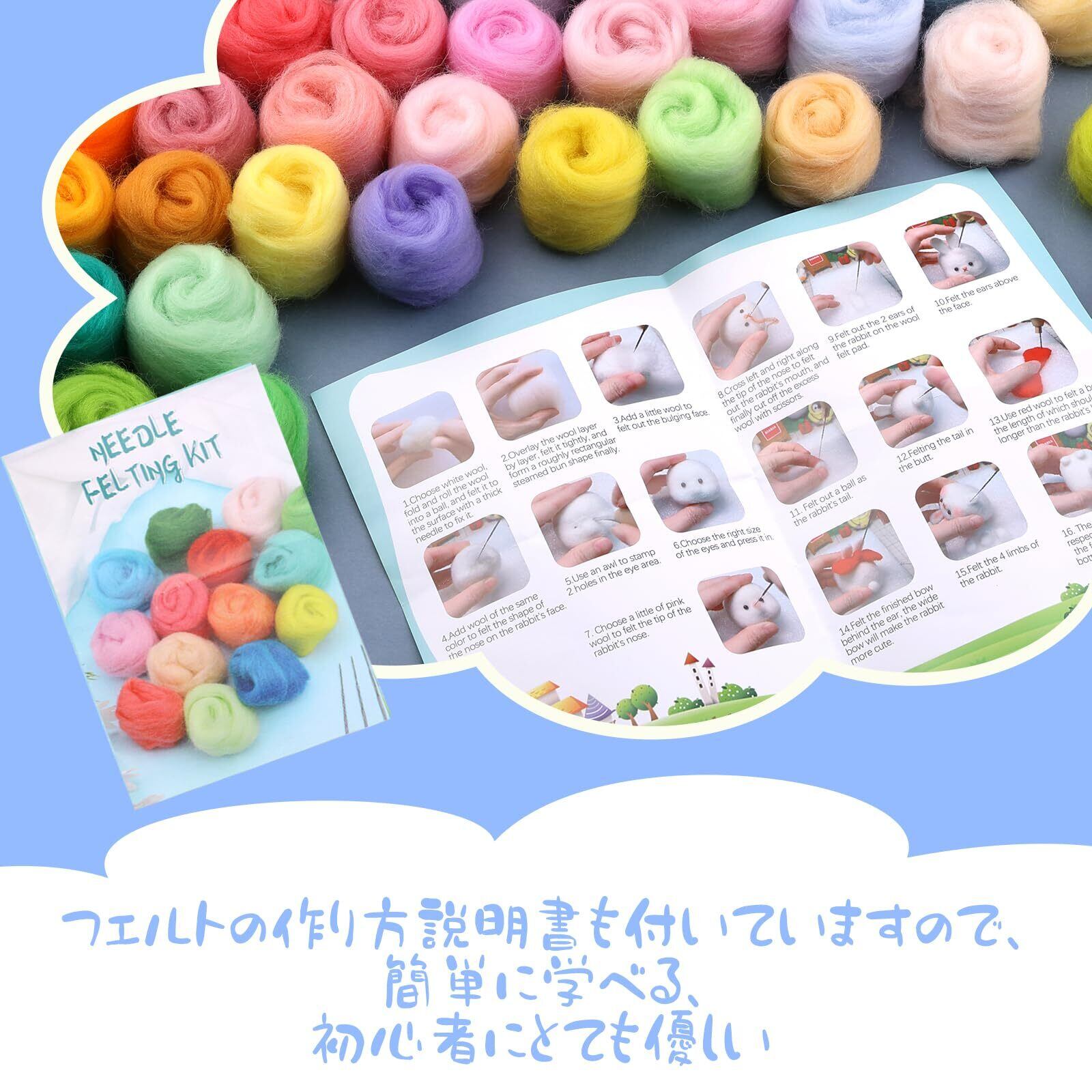 ニードルフェルト羊毛セット: この羊毛セットには72色の羊毛が含まれており、保管や整理に便利なプラスチックの箱が付いています。 個別にカスタマイズされた取扱説明書も付属しており、シンプルでわかりやすいように設計されています。