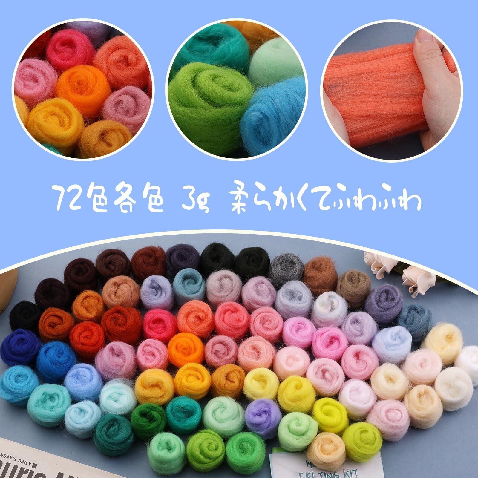 72 色のロービングウール: 72 色の各色は、フェルト化プロジェクトに幅広いオプションを提供するために慎重に選択されており、各色に 3 g のウールが含まれています。