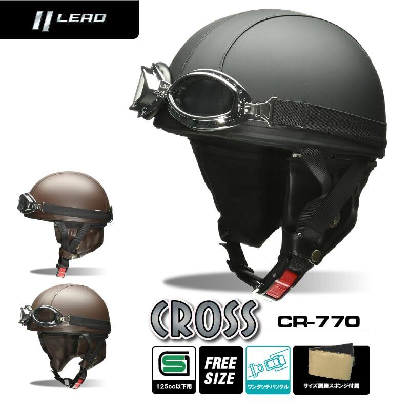 リード工業(LEAD) バイクヘルメット ハーフ レザー CROSS クロス CR-770 ブラック フリーサイズ (57~60cm未満) ビンテージゴーグル・着脱式イヤーカバー付き 125cc以下用