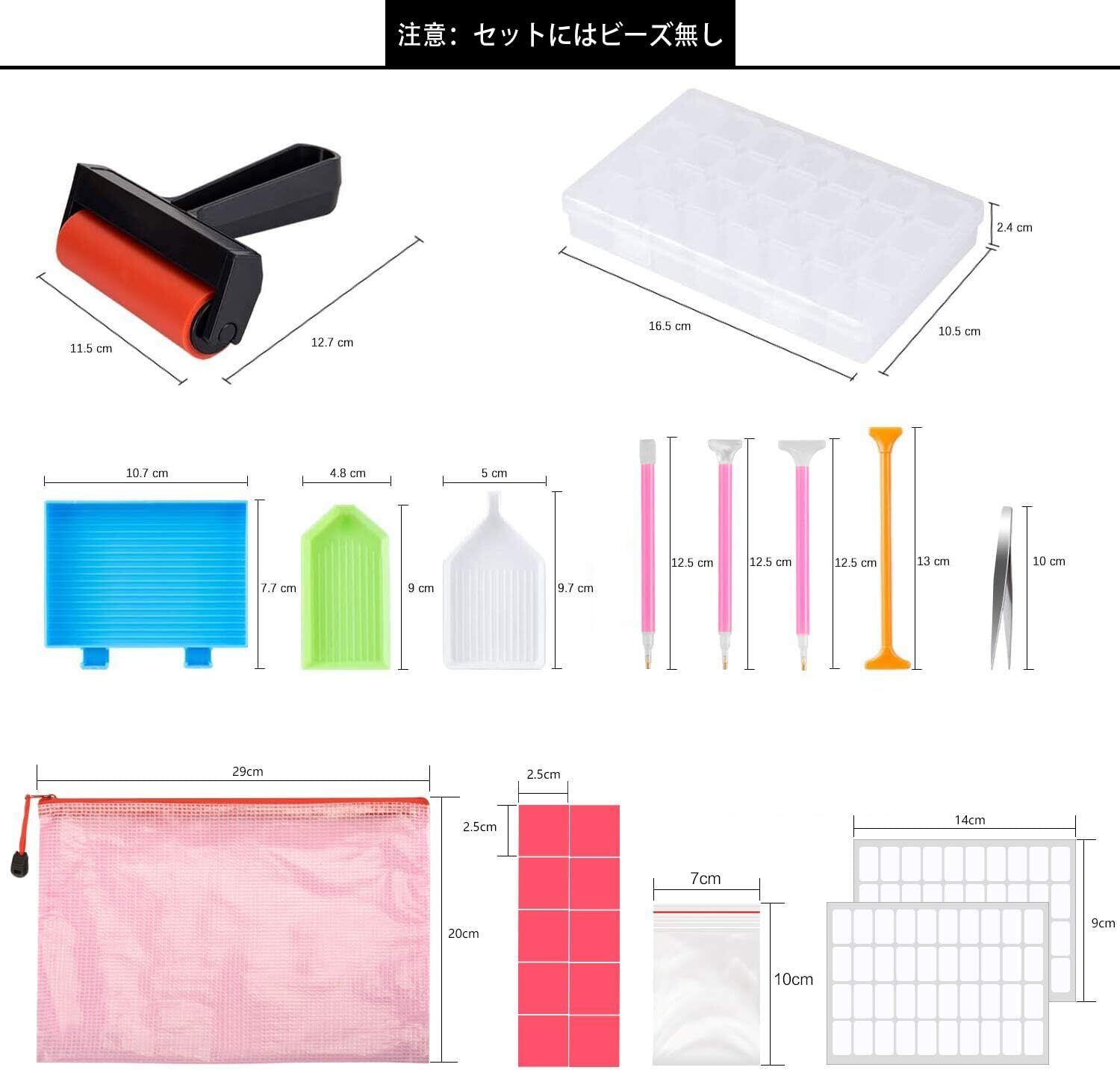 【40点セット】ビーズのトレイ*3型、グルー*10、ダイヤモンドアート専用ペン*4型、ダイヤモンドアート専用ローラー*1、チャック付きポリ袋*10、収納ケース*7、大きい収納箱*1、ラベルステッカー*2、ピンセット*1、収納袋(ブルー/ピンク)*1