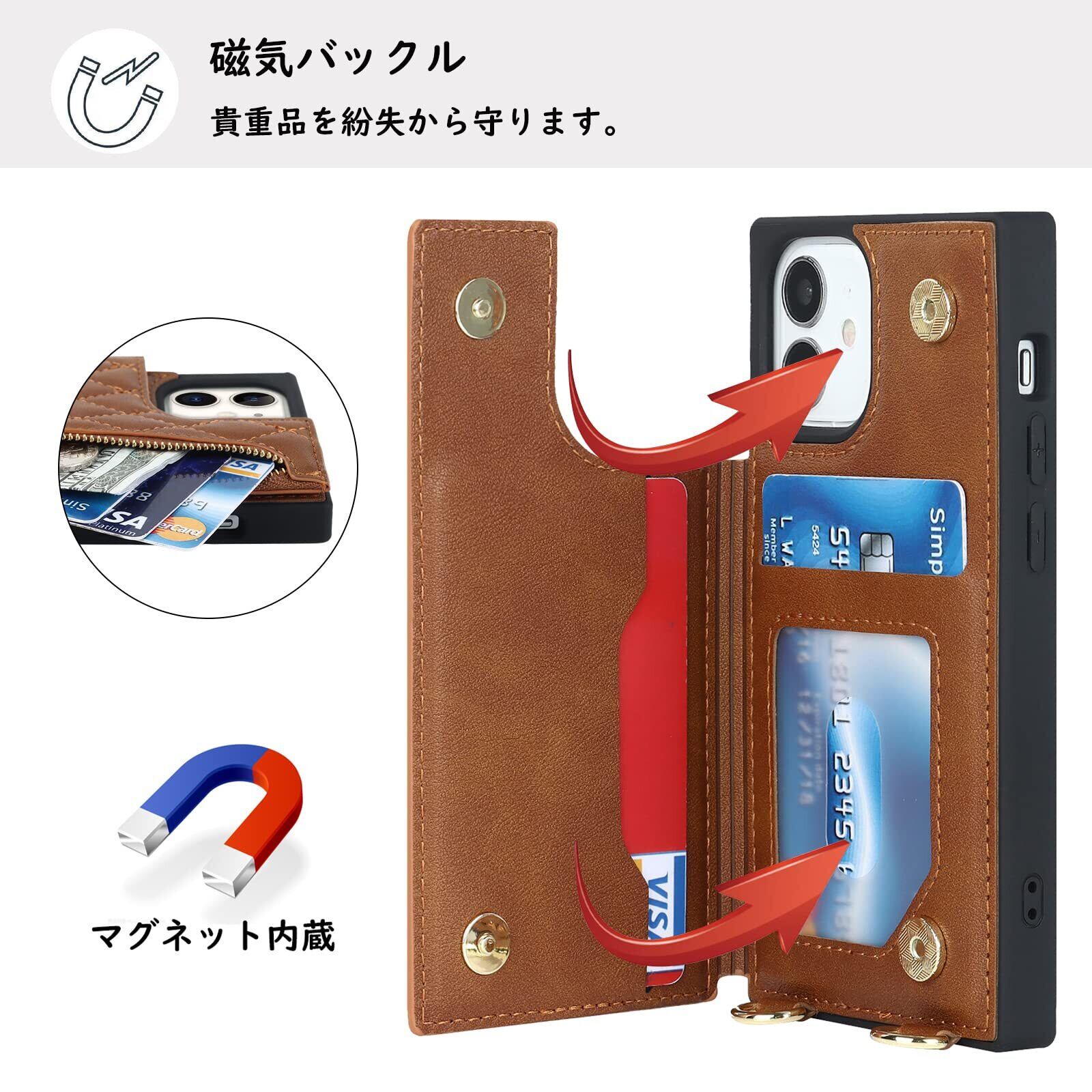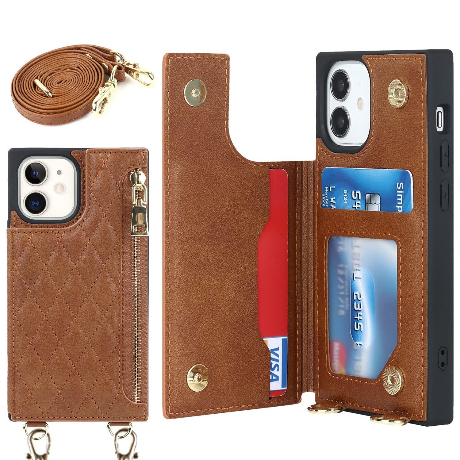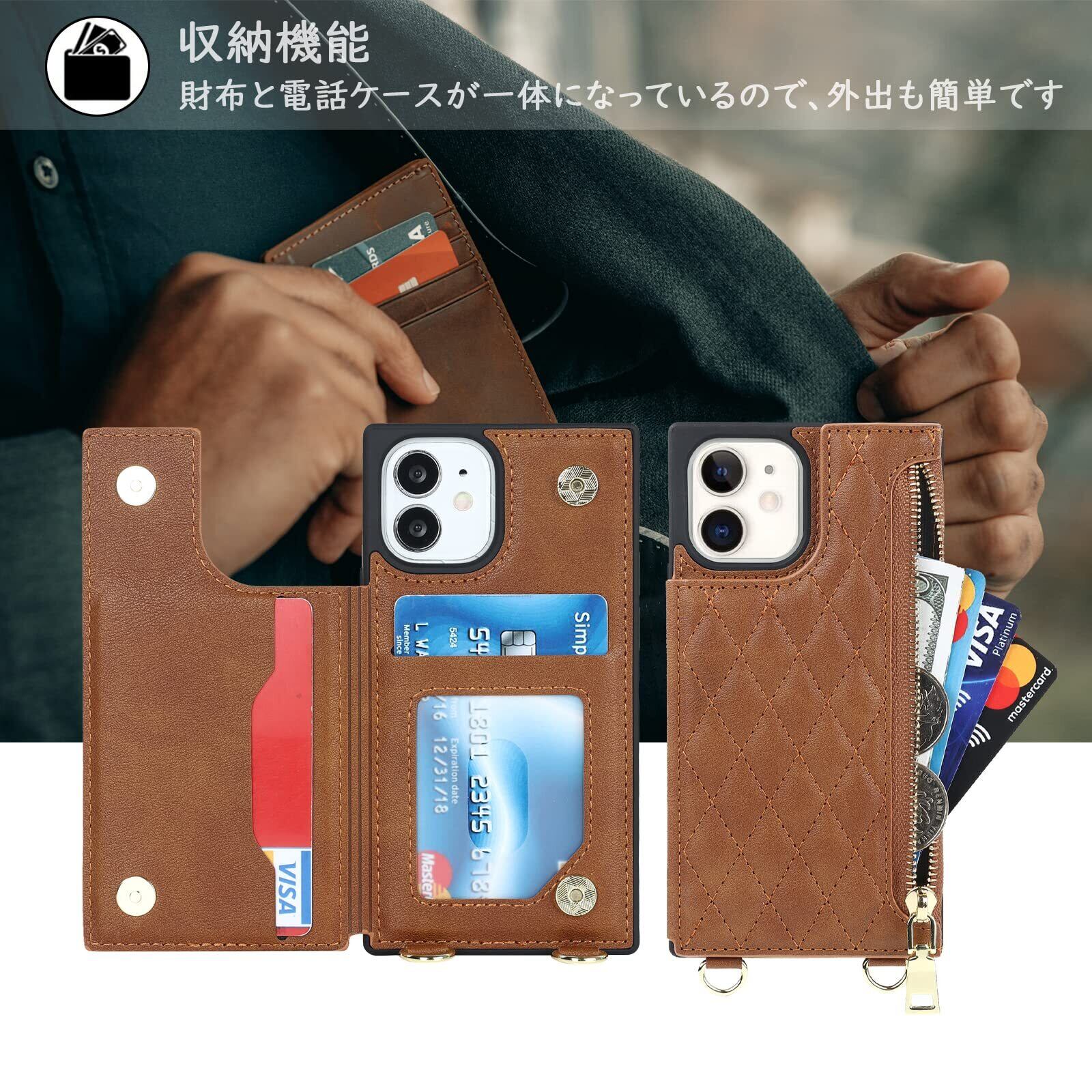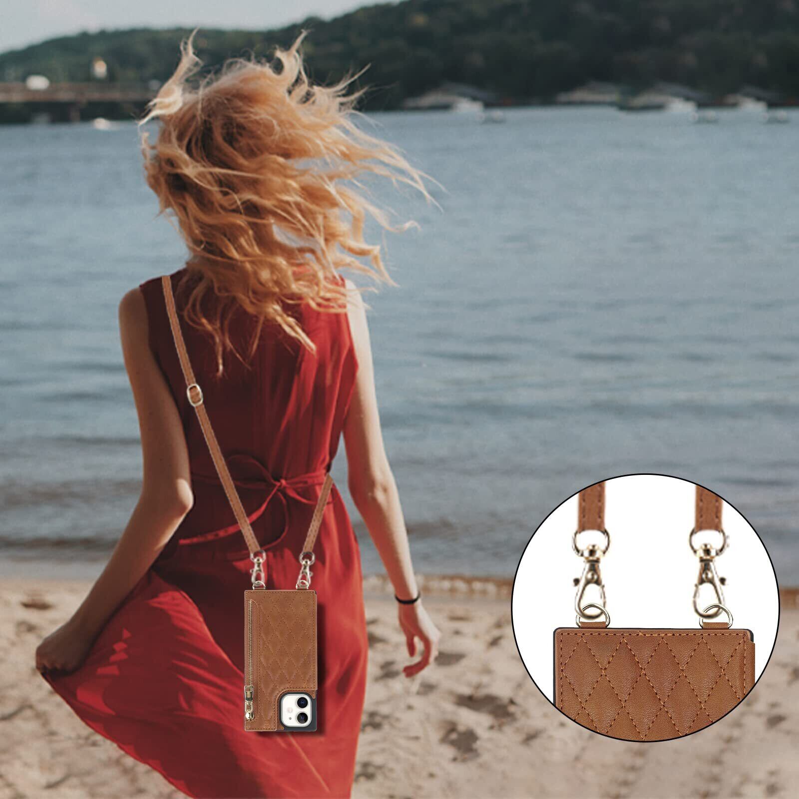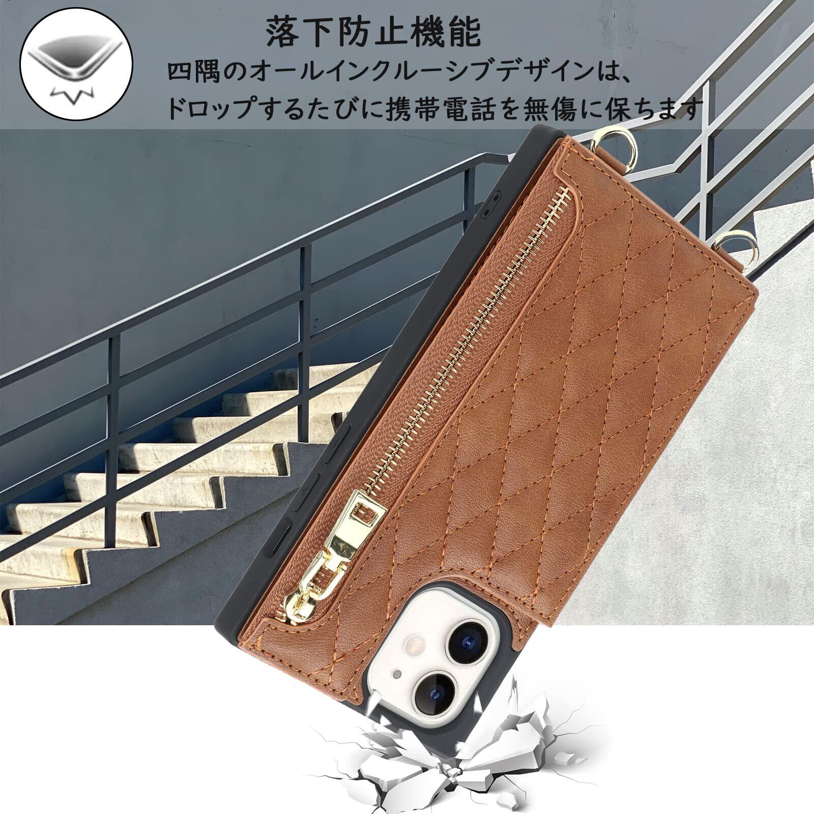【Hamany】 いphone12 ミニ ケース ショルダー iphone 12 mini ケース 手帳型 クロスボディ グリッドパターン アイホン12ミニケース ジッパー式 ストラップ付き 刺繍 スマホケース iphone 12mini 肩がけ 首掛け 斜め掛け 収納 ファスナー型 耐衝撃 レザー カバー-茶褐