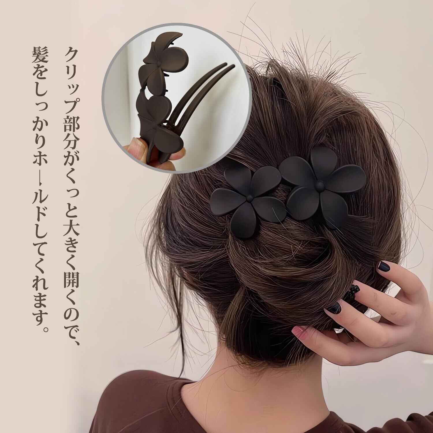 Hebite サイドバンスクリップ2点セット 髪留め 花形ヘアクリップ ハーフアップ クリップ ヘアアレンジ 大きめ レディース ヘアアクセサリー シンプル おしゃれ 韓国風 髪飾り マット 花モチーフ 可愛い 普段使い 職場 仕事 通勤 女性用 婦人用 収納ボックス付き ブラックxブラウン