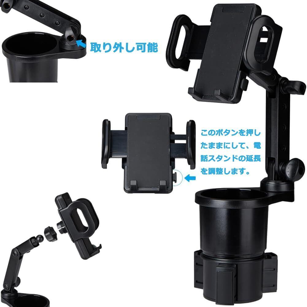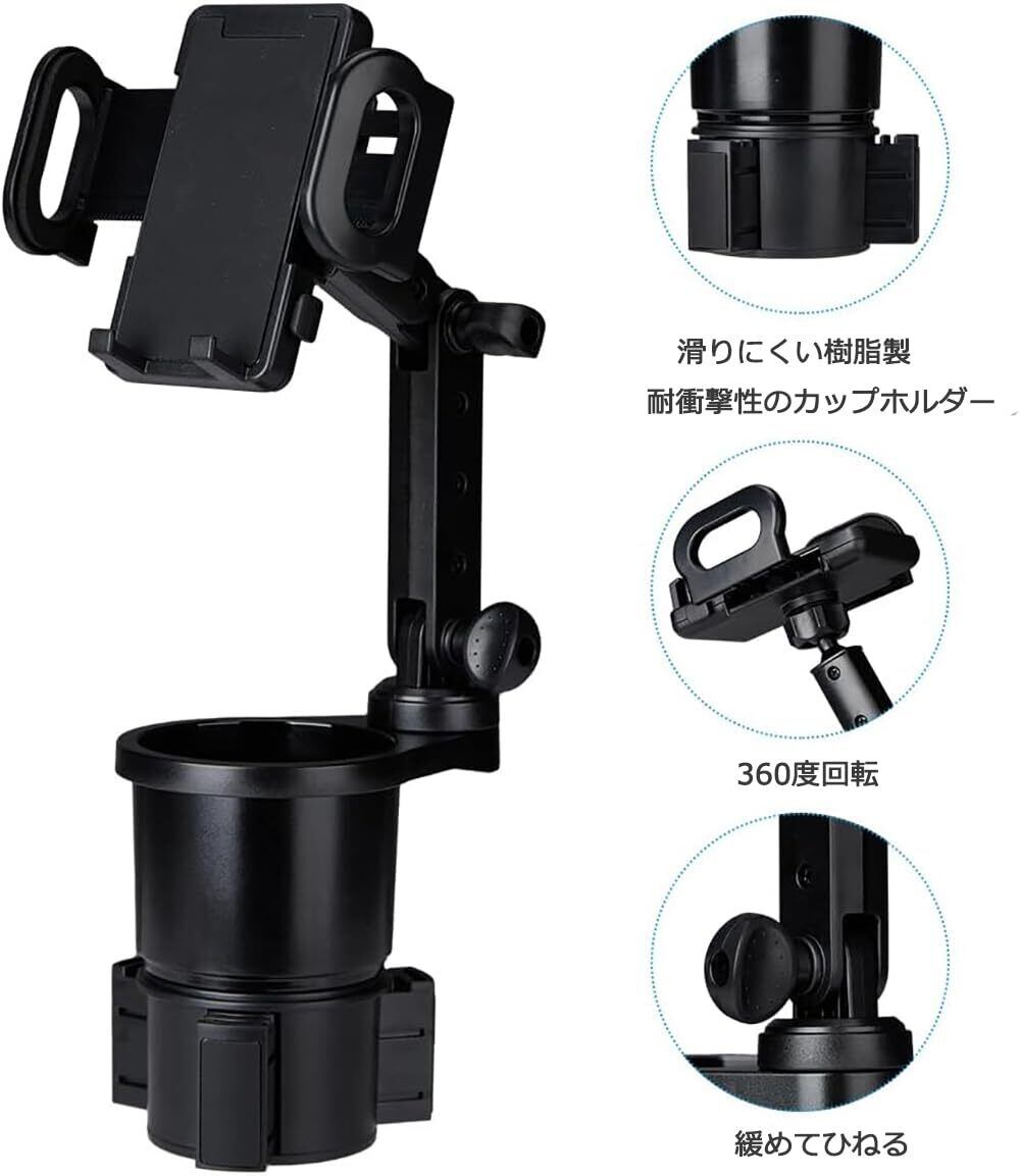 スマホホルダー 車用カップ ドリンクホルダー カップスタンド 360度 回転 カップホルダー付き携帯電話ホルダー マウント 携帯電話スタンド iPhone/Android スマートフォン用