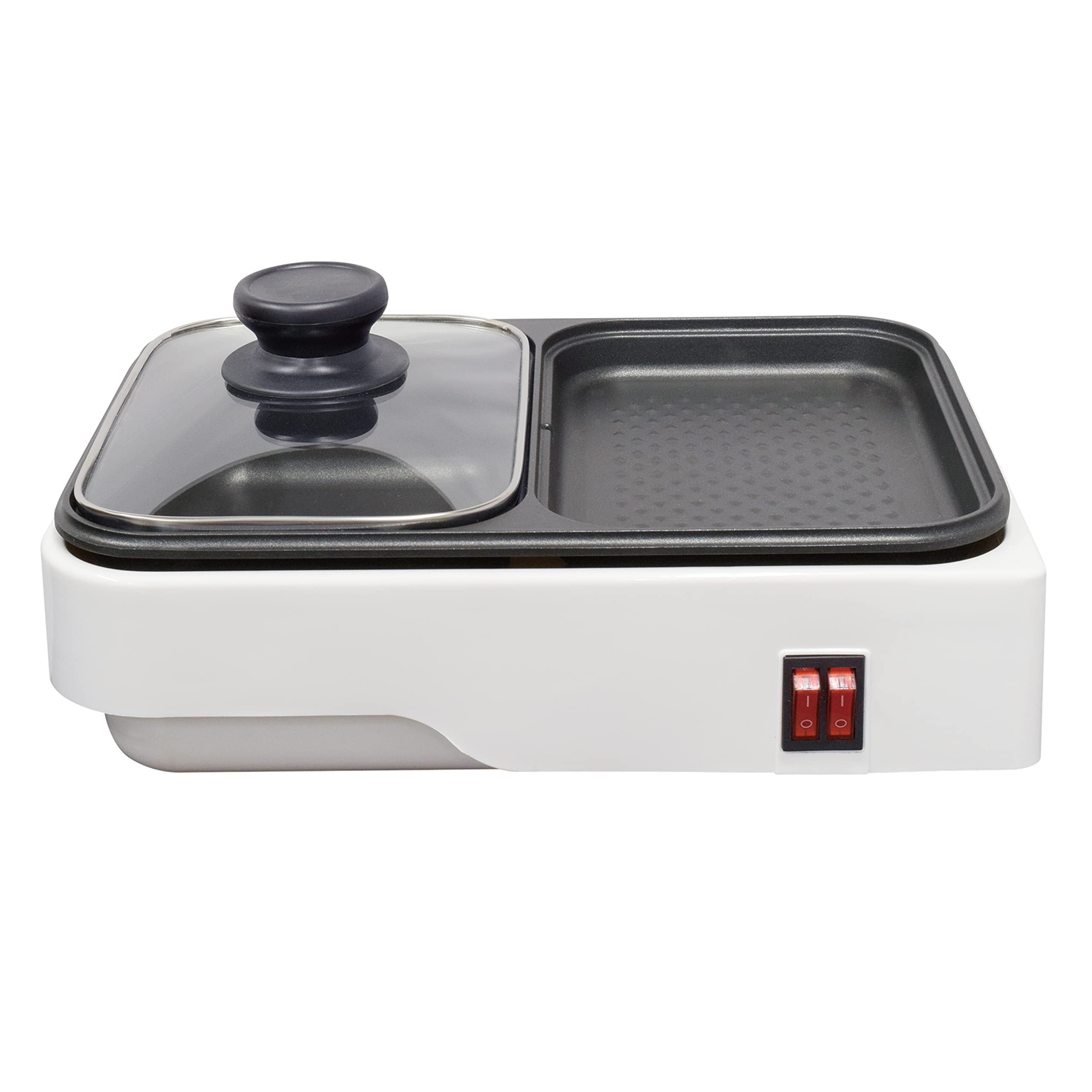 一度にプレートとグリル鍋を使用しての調理が可能でコンパクトで場所をとらない。(スイッチをオン/オフするだけの簡単操作)