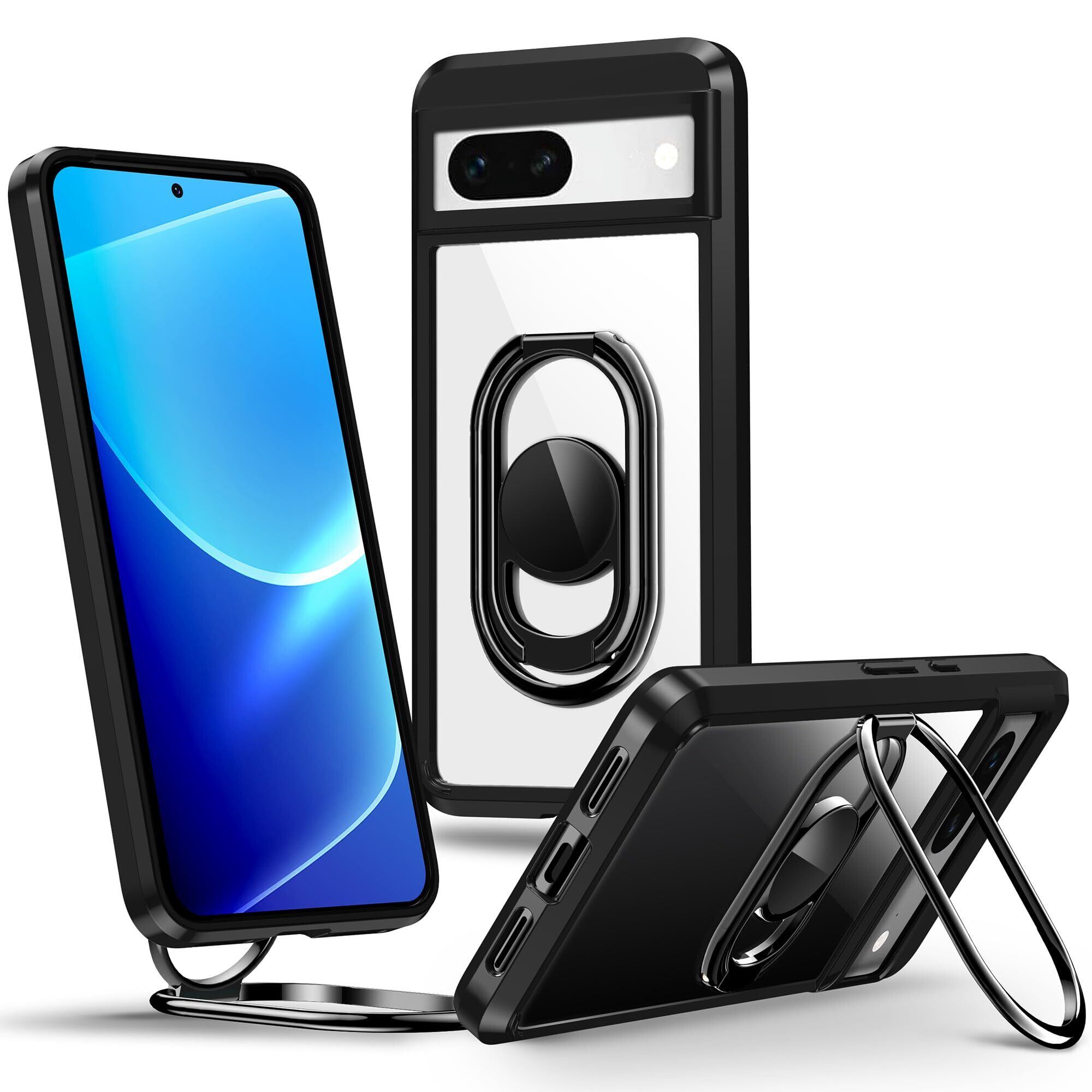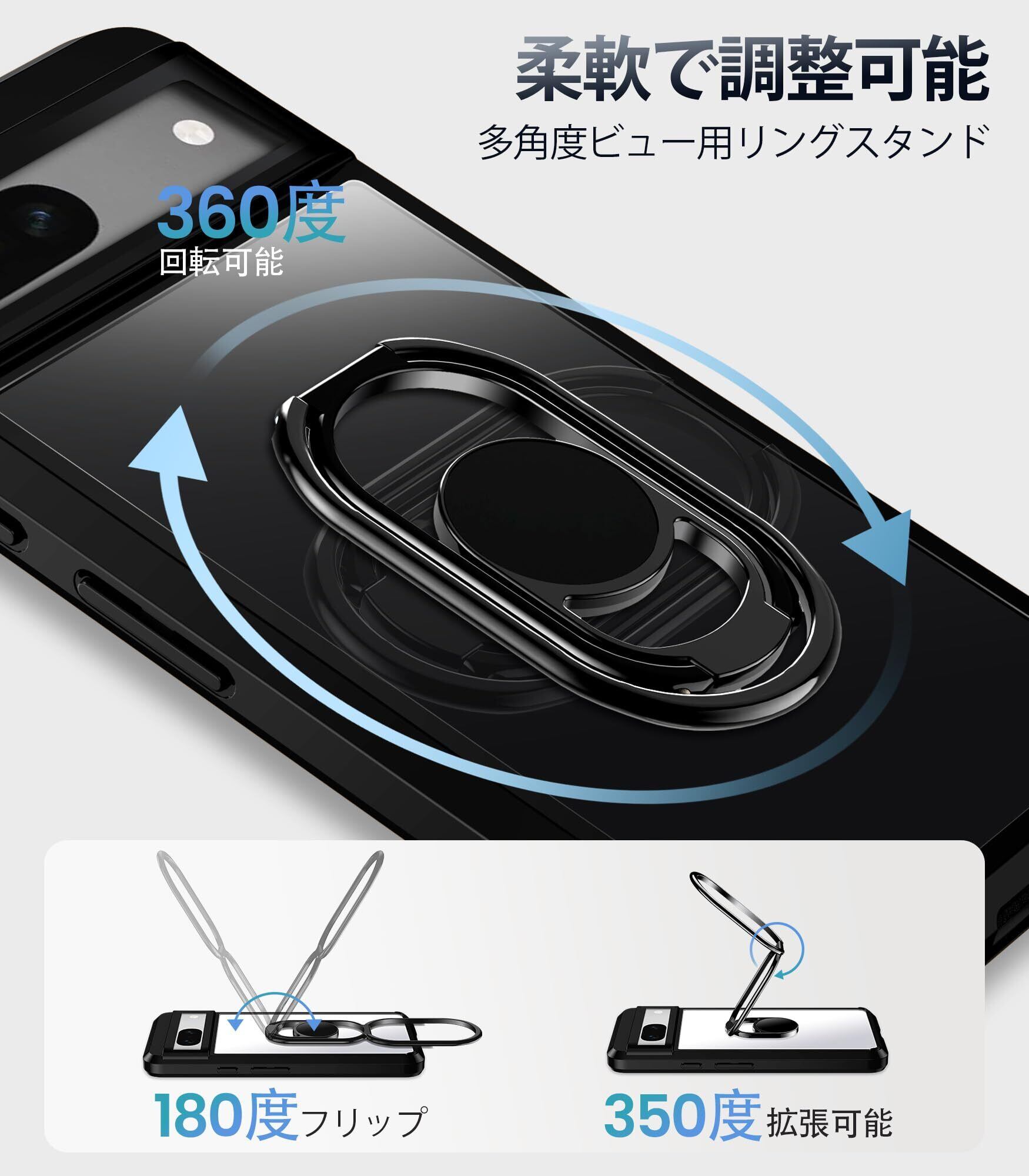 【自由に回転するリングスタンド】 このPixel 8A 5Gのケースには、360°回転するベースと、それぞれ最大180°および350°まで調節可能な2つのアームが搭載されています。多彩なハンズフリー視聴オプションを提供します。
