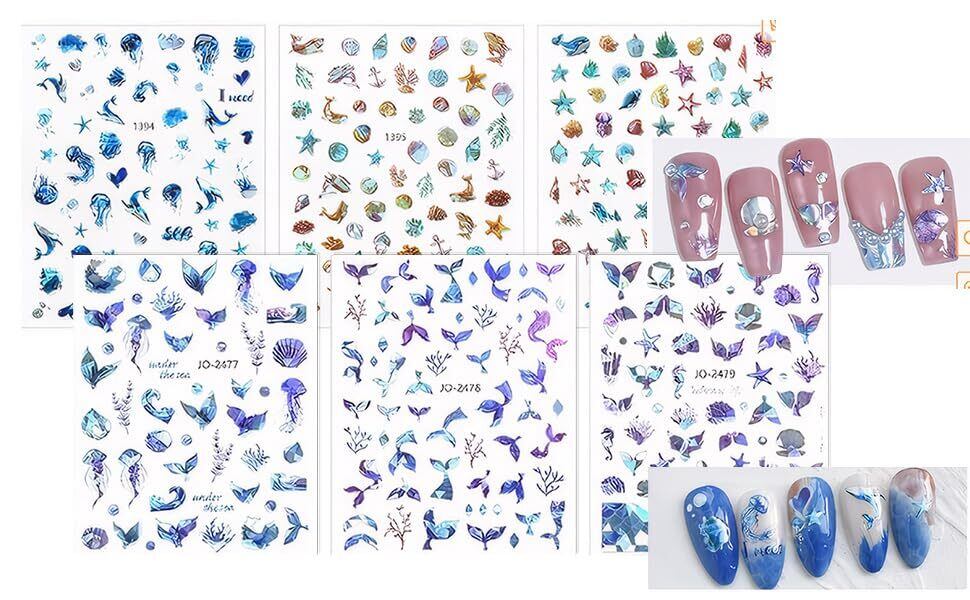 ネイルシール 海 ネイルステッカー 6枚セット 海の生き物 夏 サマー 貝 人魚 クラゲ オーロラ 夏祭り