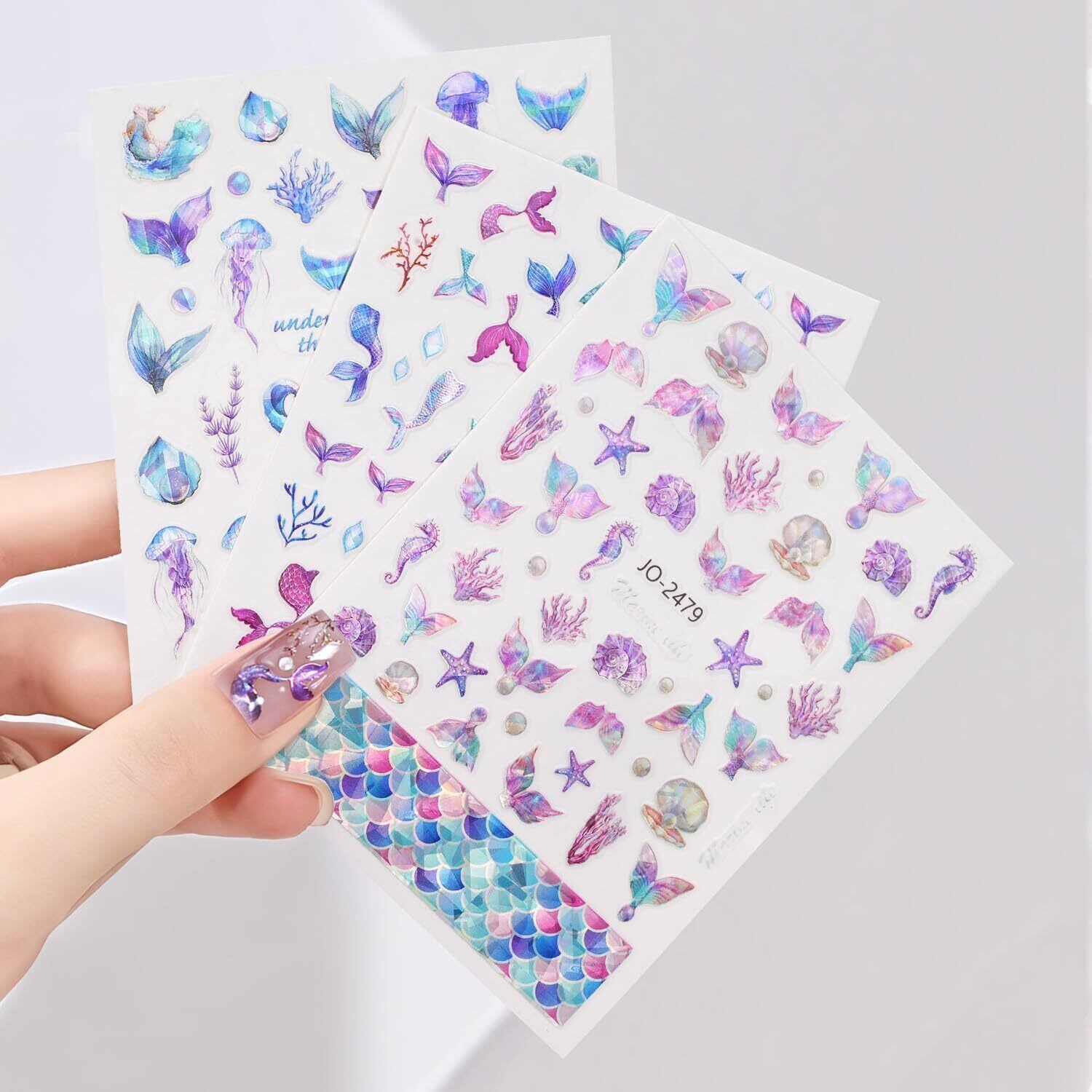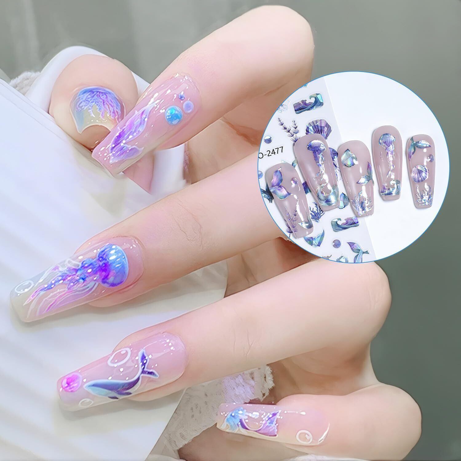 【海ネイルシール】ネイルシール海は、全体のカラーはに青と紫で、貝やクラゲ、人魚など海の生き物の模様が施され、海洋スタイルがいっぱいです