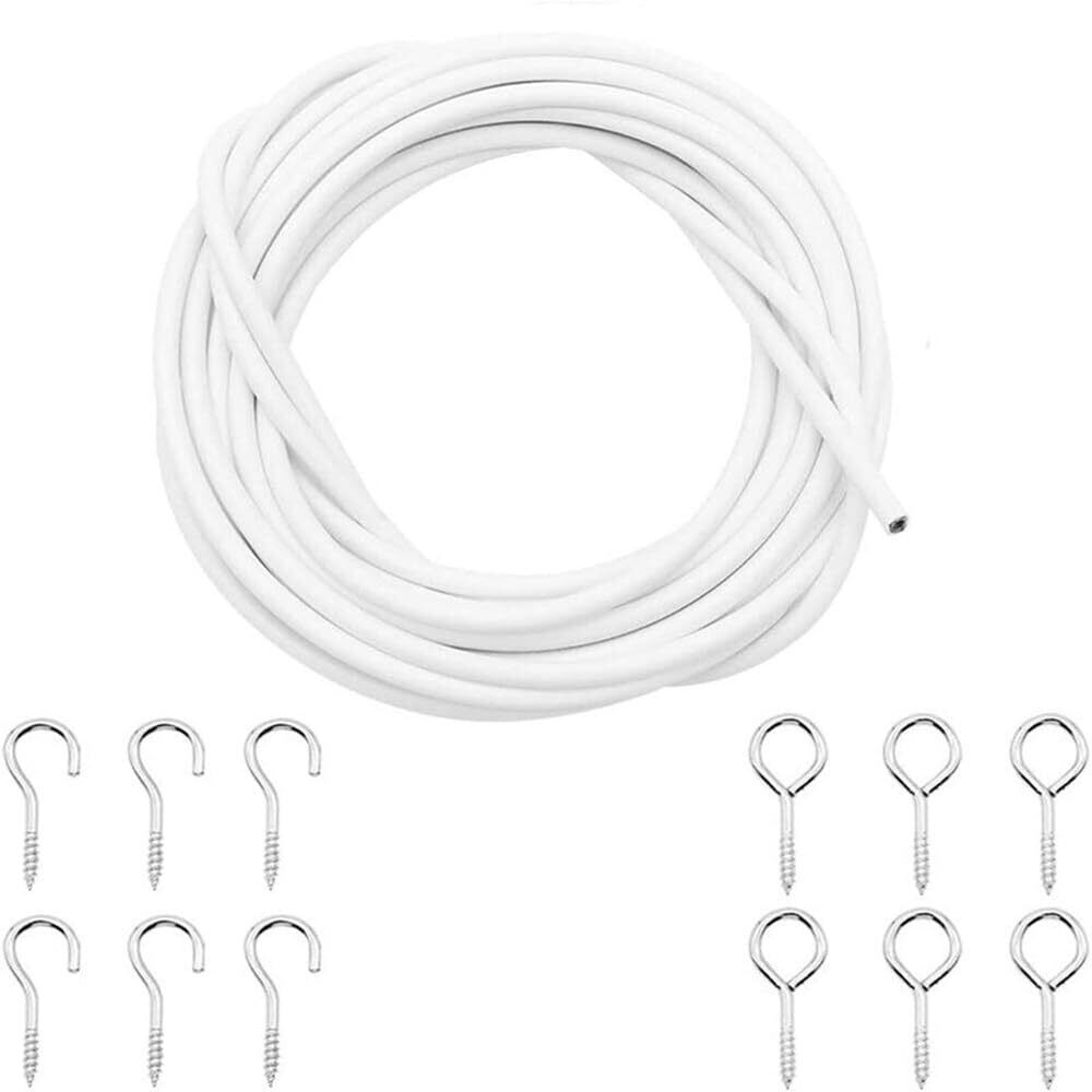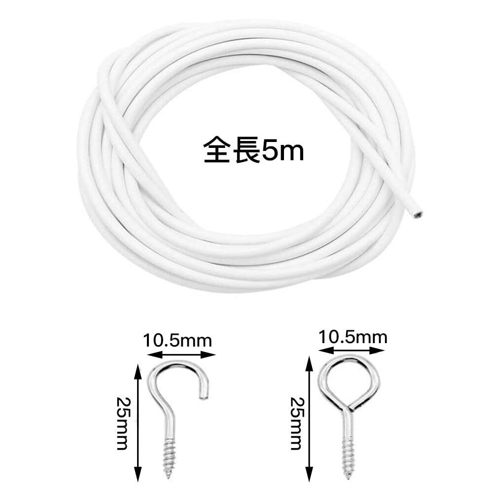 【サイズ】ワイヤー 5m。ネジ・フック 2.5×1.05cm。【素材】スチールワイヤー、PVC。