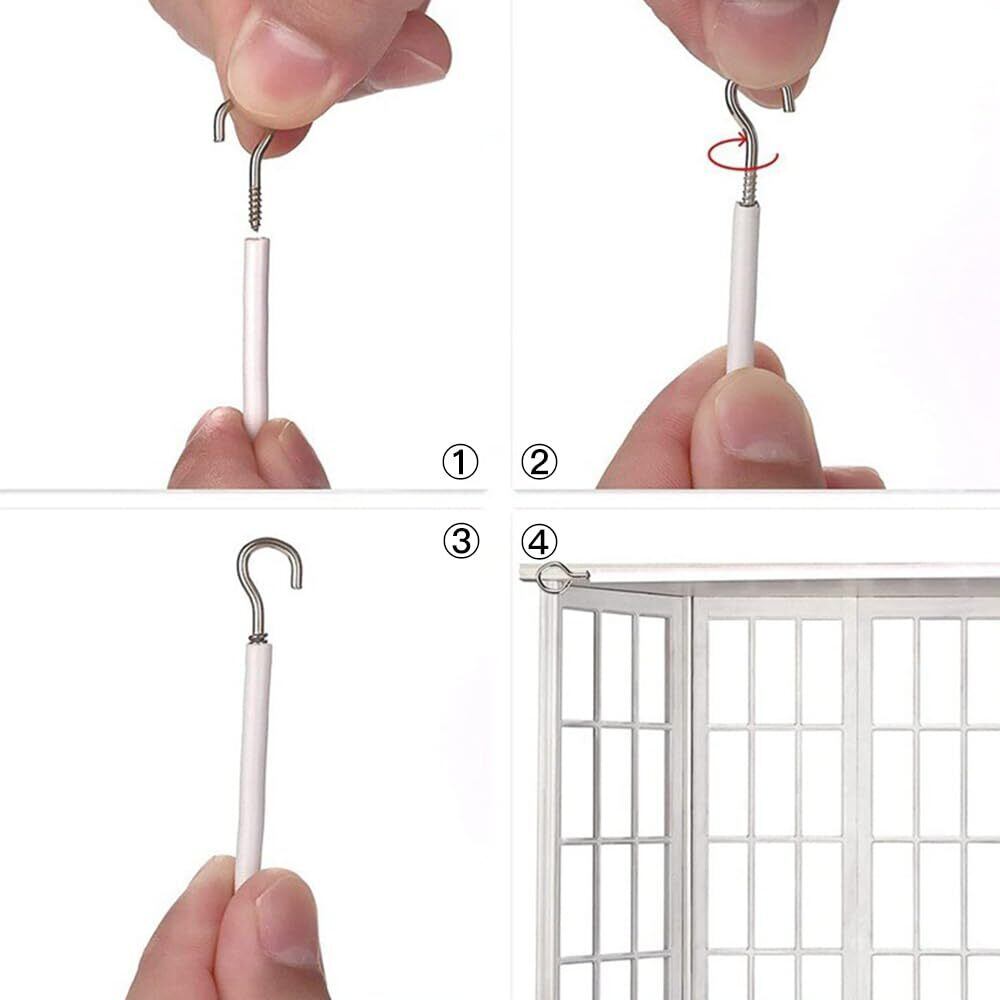 【使用方法】ペンチを使用して簡単にワイヤーを切断できます。切断したワイヤーの端に付属のフックを差し込み、設置したい場所にネジを回して取り付けるだけです。
