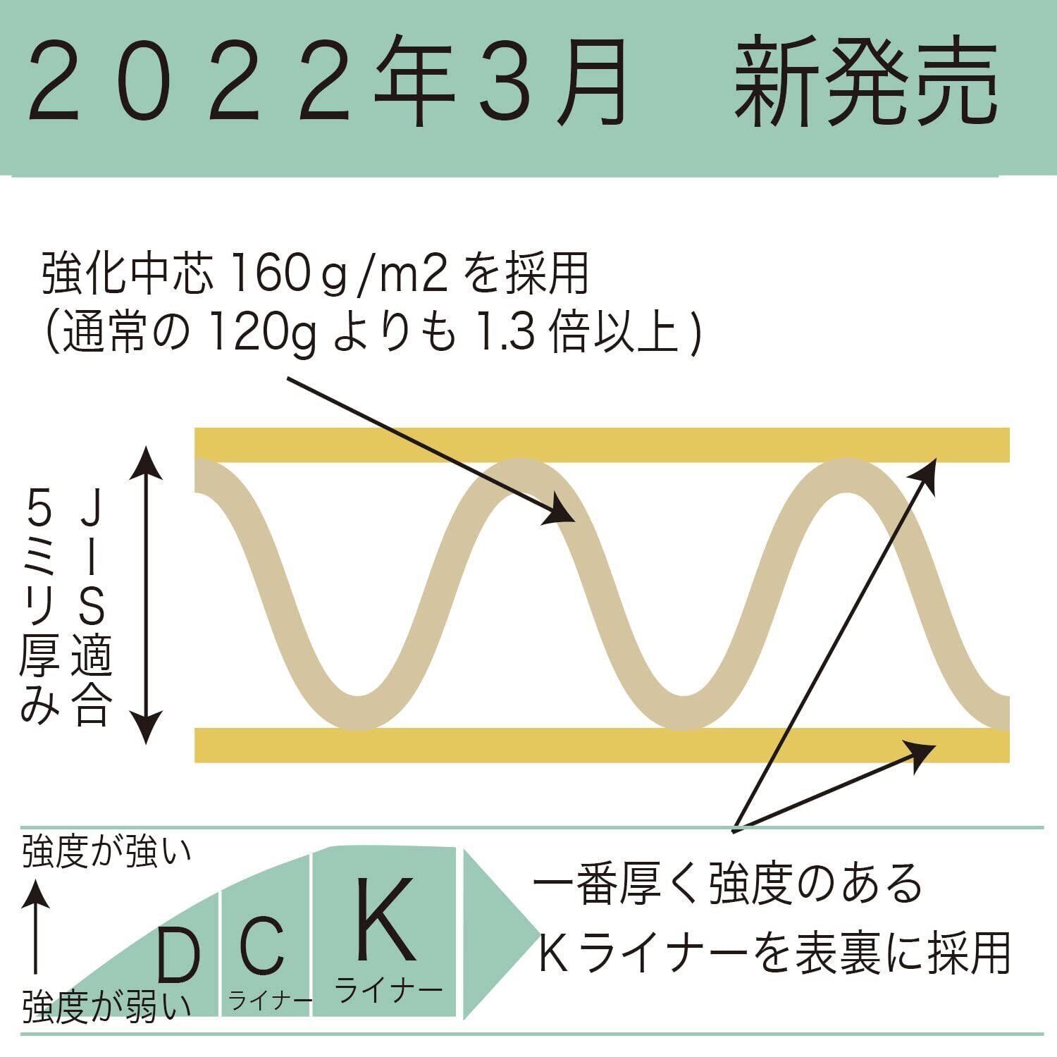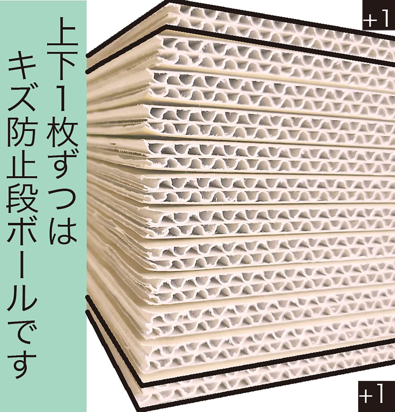 5mm厚でさらに、とても強度がある「中芯160g」 採用。型式: A式(みかん箱型) / 色: クラフト / 日本製 / (上下に破損防止用として1枚ずつオマケがあります) ポリ袋には入っていません。材質: ライナー 表面K5 裏面K5クラフトライナー紙の中では最高ランクのKライナーを使用。強靭な強度を誇ります。中芯Aフルート (中芯160g)日本のJIS規格に適合したAフルート(5mm厚)段ボール中芯の段目の山の数が30cmあたり34個±2とJIS規格で定められている、日本国内では一般的な厚さのダンボールです。強度があるため、さまざまな場所で使われています。昔から引っ越しのダンボールや、青果・野菜などの運搬でも使われています。Aフルート(JIS 規格適合)&(市販品よりもワンランク強度が優れた)中芯160g採用
