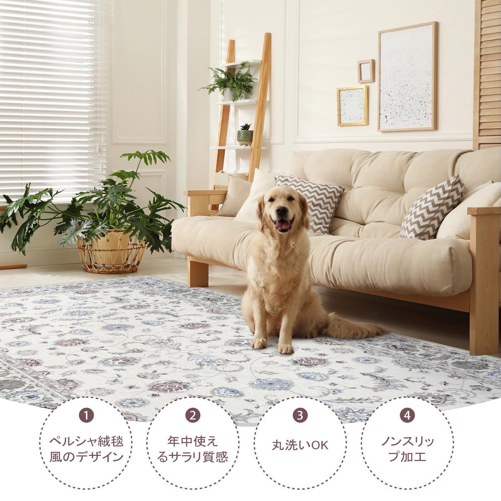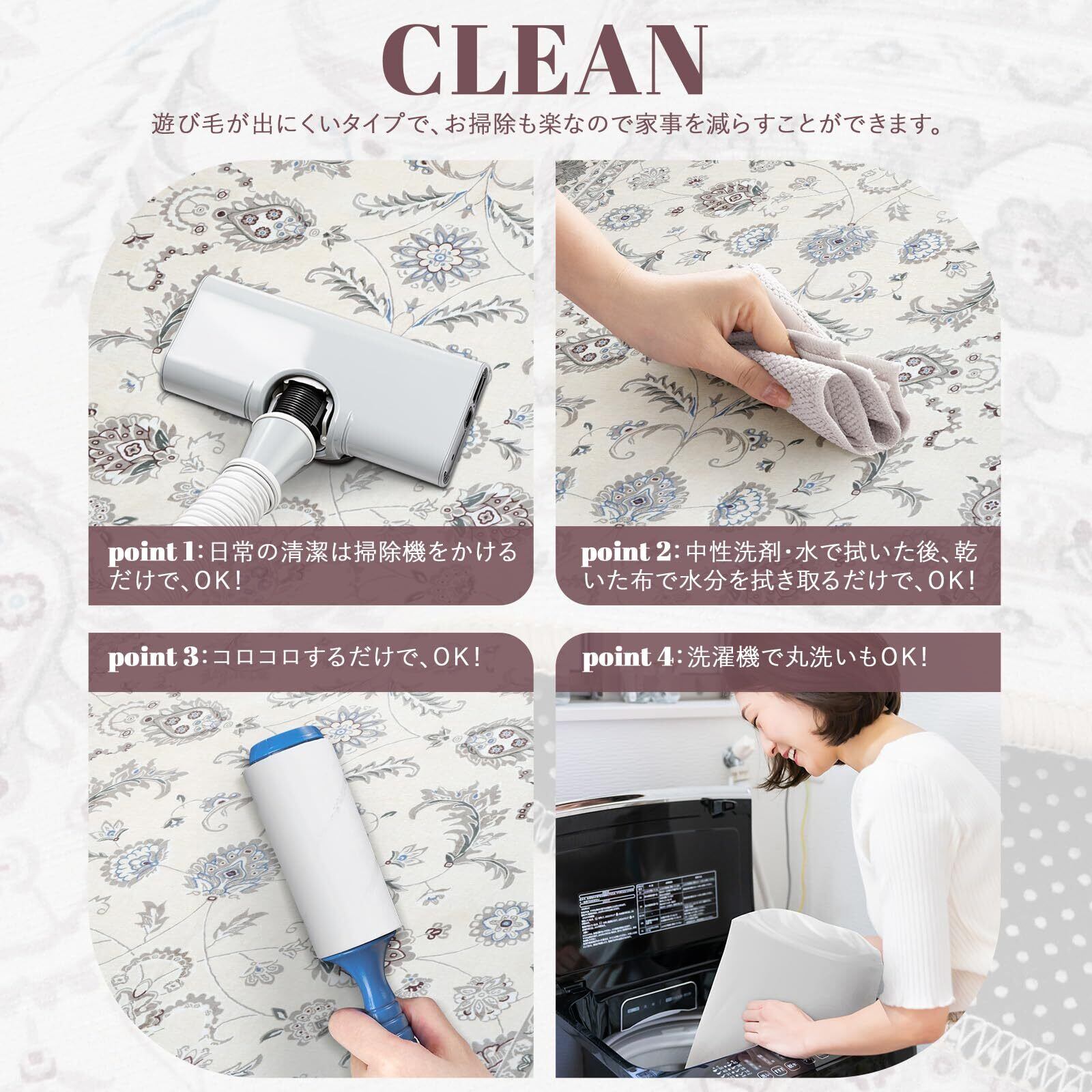 【お手入れ便利】毛足がないので、ゴミが絡みにくく、日常の清潔は粘着クリーナーをコロコロするや掃除機をか けるだけでキレイになります。また、汚れた場合は手洗いや洗濯ネットに入れて洗濯機で洗うことができます(ご 注意:風通しの良いところで陰干しし、アイロン、乾燥機の使用をお避け下さい。)